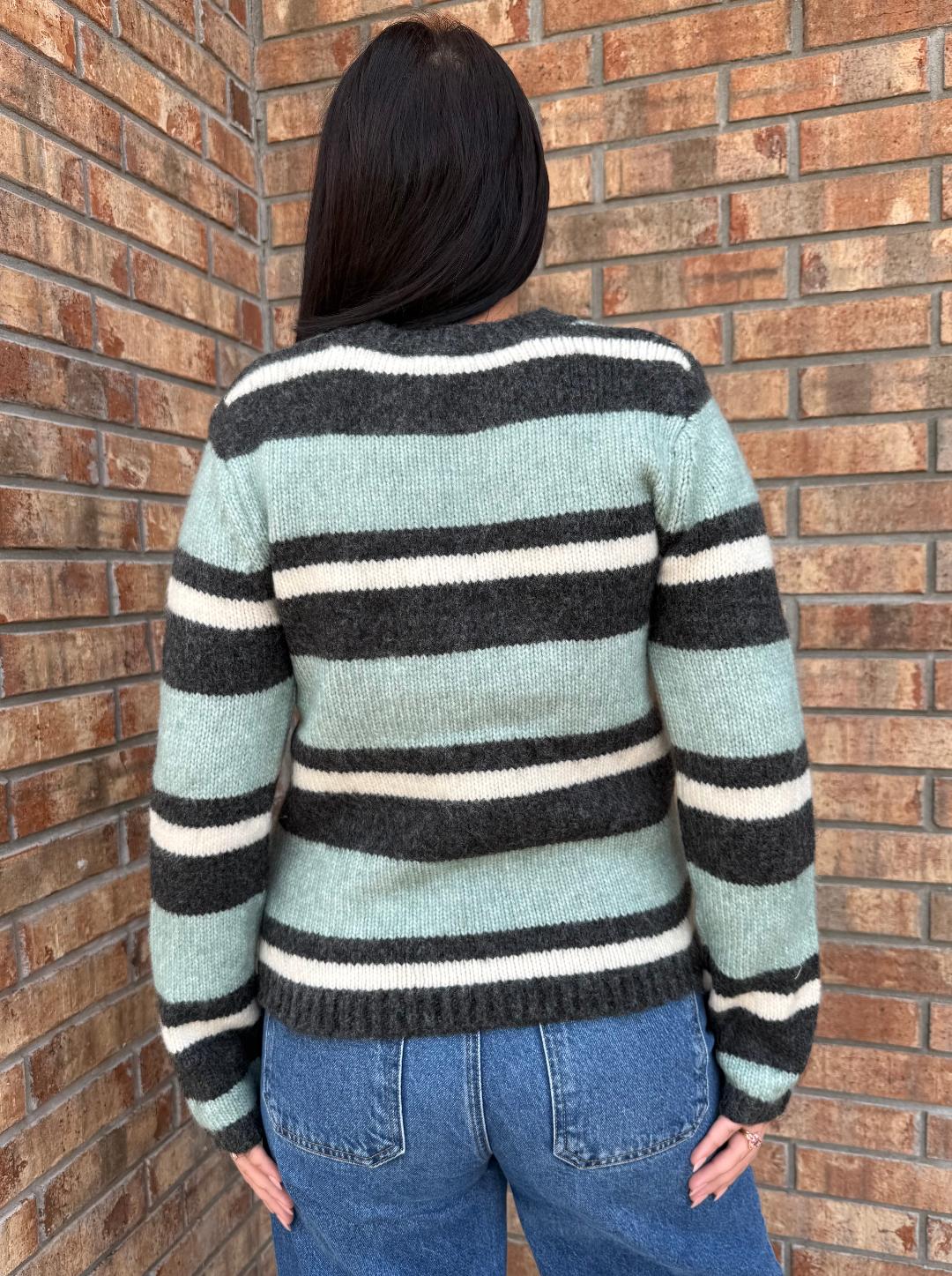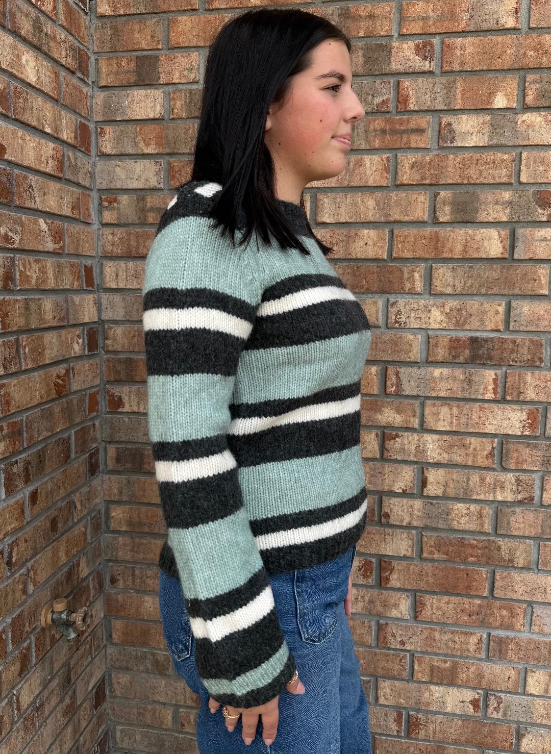 This striped sweater is a cozy statement piece with a playful yet classic vibe. Designed in wide horizontal stripes of soft mint green, charcoal grey, and creamy white, it offers a fresh contrast that feels both modern and timeless. The knit is slightly fuzzy for a warm, inviting texture, while the relaxed fit and crew neckline make it easy to wear for everyday comfort. Ribbed trims at the hem, cuffs, and neckline add structure and polish. It’s the perfect throw-on sweater to pair with denim for casual days, or to layer over a collared shirt for a preppy twist.