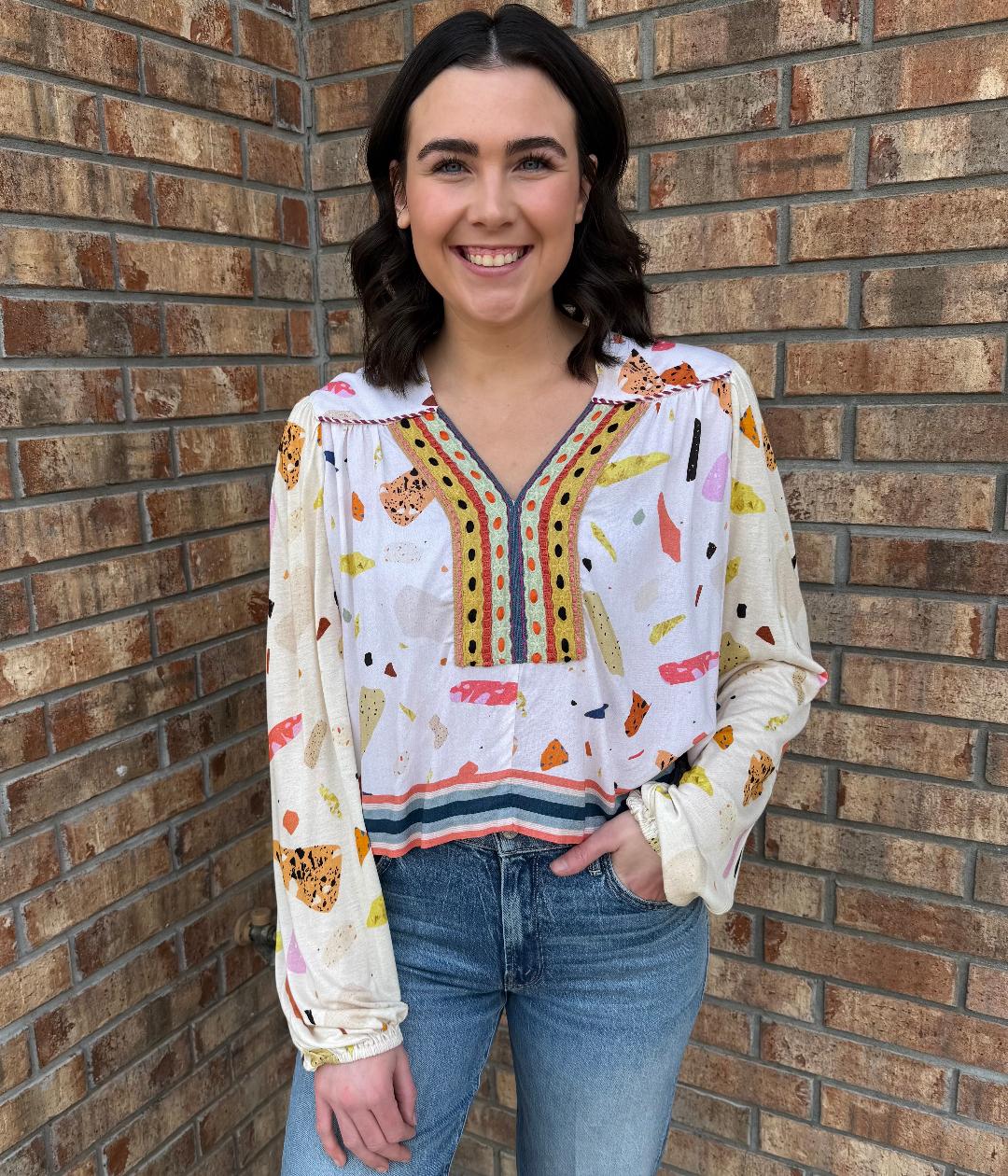 Need a new, super unique top? Add this one to your collection - it won't disappoint! A colorful abstract print with heavy embroidery on the neckline. Style with any of your favorite bottoms.