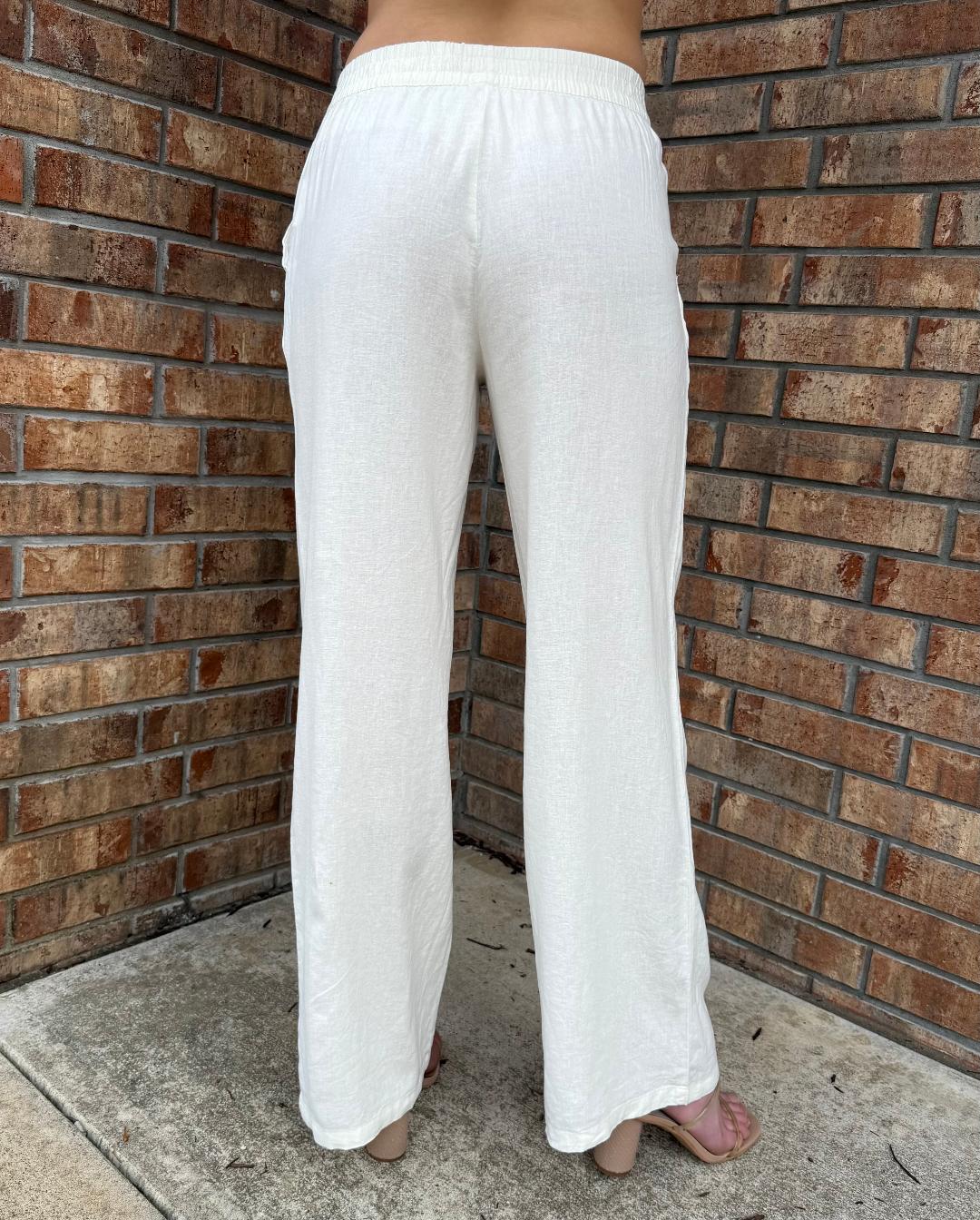 Perfect for warm weather and effortless style, this cream wide/straight leg pant features an elastic waistline and pockets, combining comfort with easy elegance. Lightweight and breathable - ideal for summer days, travel or casual outings. This pant will give you lots of styling options but we love it with the matching Cream Linen Blend V-Neck Top.