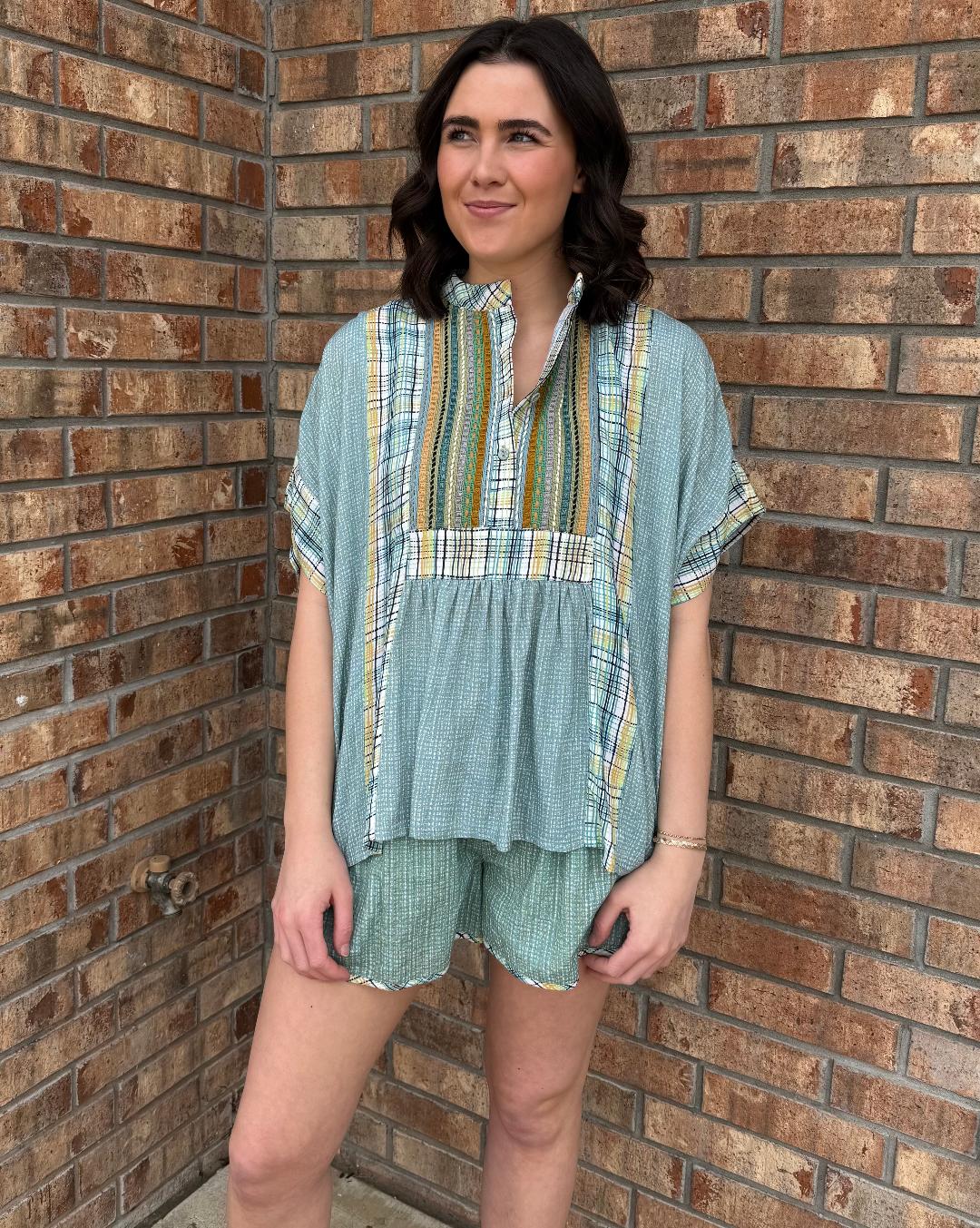 This one size kaftan style top stands out with its unique plaid prints and embroidery on the chest by the button placket. For a complete matching set, get the Vladana Shorts or change it up by styling it back to your favorite jeans.