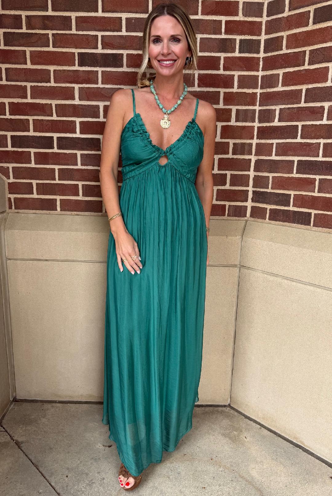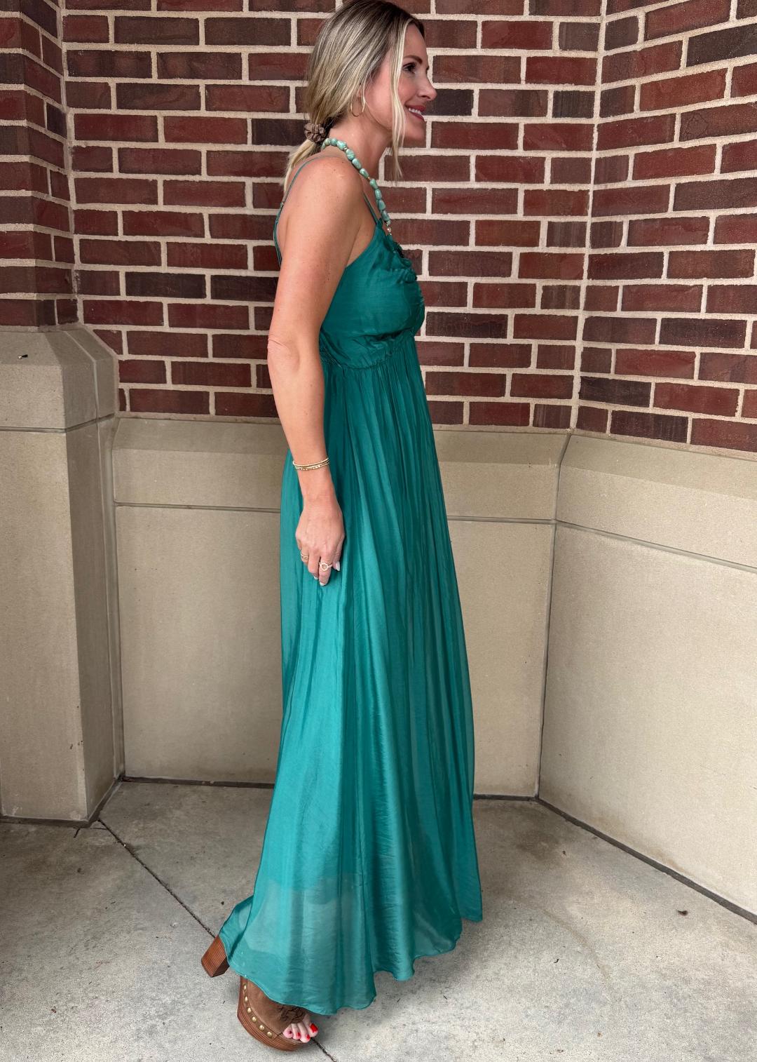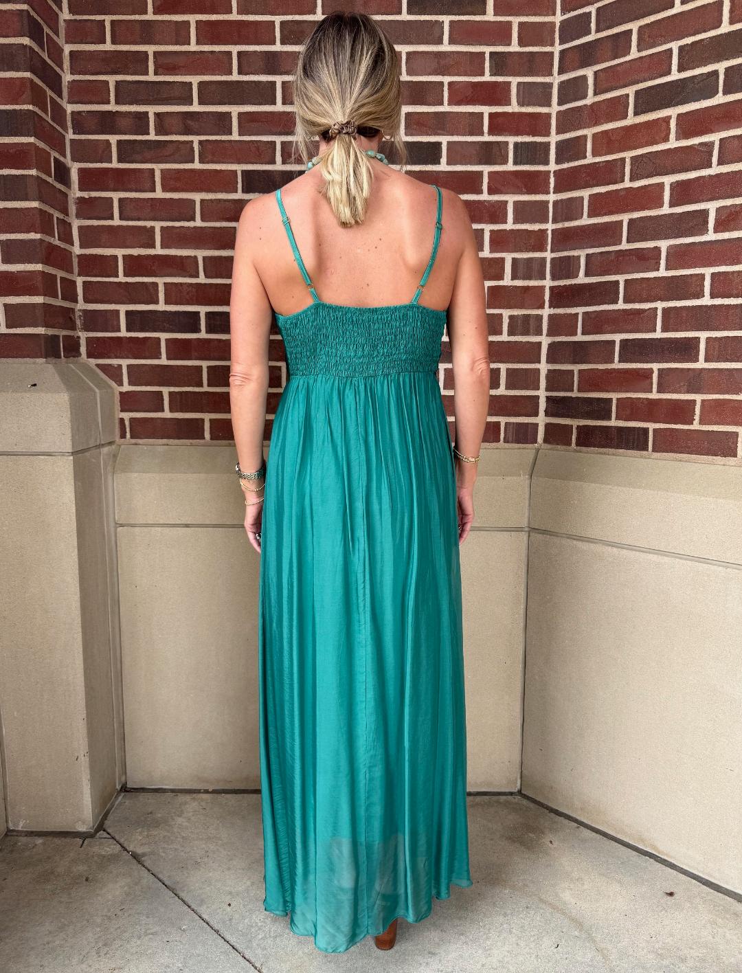 This effortlessly elegant maxi dress is part of a special collection by Deluc, made in Italy. Crafted in a luxe silk-viscose blend, giving it a soft, airy feel with a beautiful fluid drape. Designed with a flattering empire waist, it features a delicately gathered bust with an adjustable center detail that allows you to customize the neckline to your liking. The slender shoulder straps are also adjustable, ensuring the perfect fit and support. The bodice is softly smocked through the back for added comfort and flexibility, while the skirt flows into a breezy, full-length silhouette that moves gracefully with you. Fully lined with a lightweight, breathable knit, this piece offers ease and coverage without sacrificing that light-as-air feel. An elevated yet effortless style, perfect for warm days, vacation moments, or dressed up evenings.