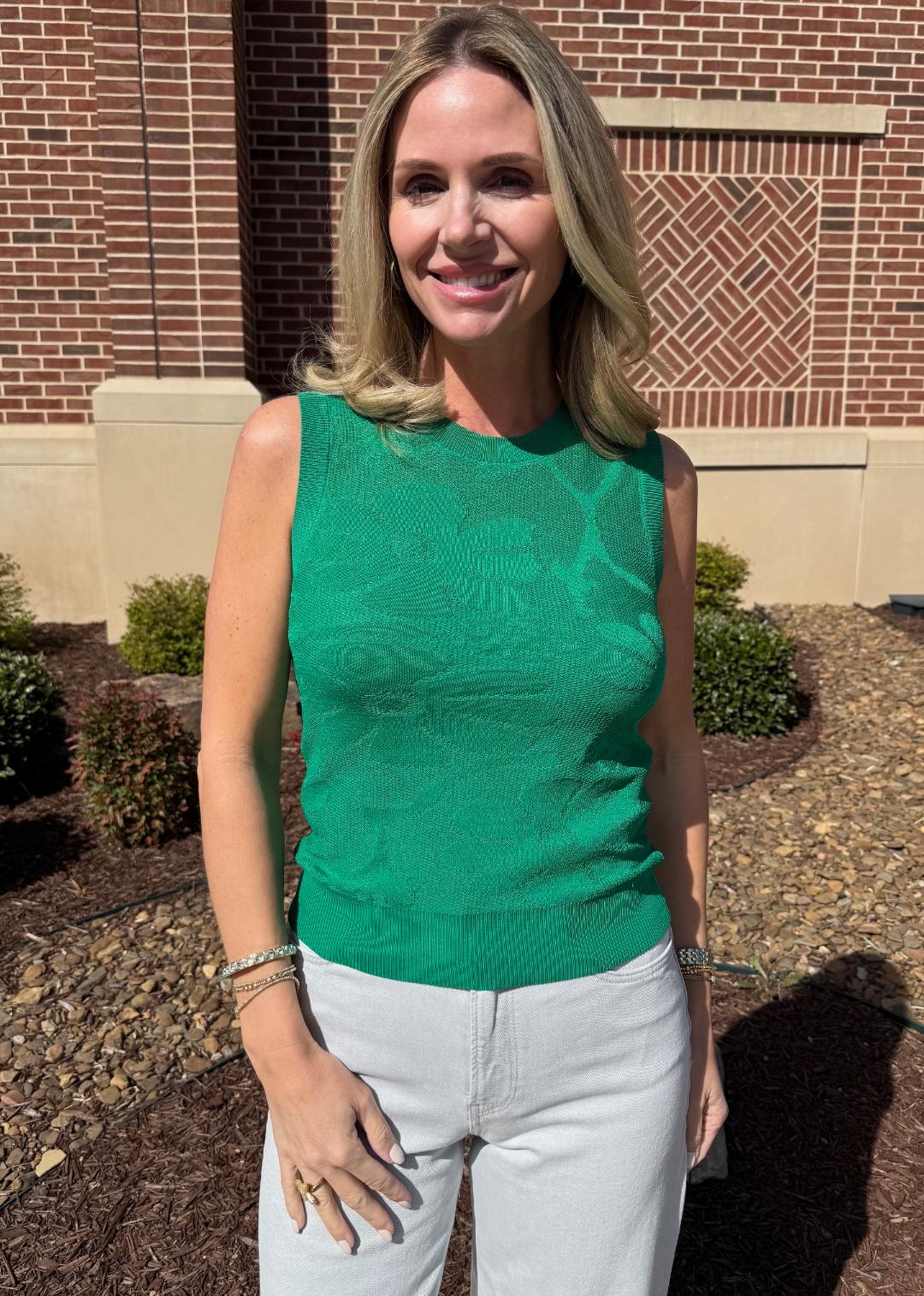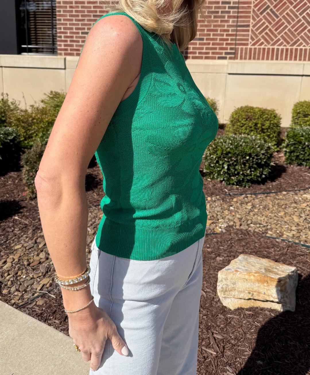 This vibrant green knit tank is the perfect blend of elevated and effortless. Designed in a soft, lightweight sweater knit, it features a subtle tonal texture throughout that adds dimension while keeping the look clean and polished. The sleeveless silhouette is finished with a classic crew neckline and ribbed trim at the neckline, armholes, and hem for a structured yet comfortable fit. It has a nice, slightly fitted shape that flatters without feeling tight, while the knit offers breathable stretch for all-day wear. Easy to dress up or down, this piece pairs perfectly with denim, trousers, or layered under a jacket. It’s one of those elevated basics that adds a pop of color while still feeling timeless and versatile. Works through any season!