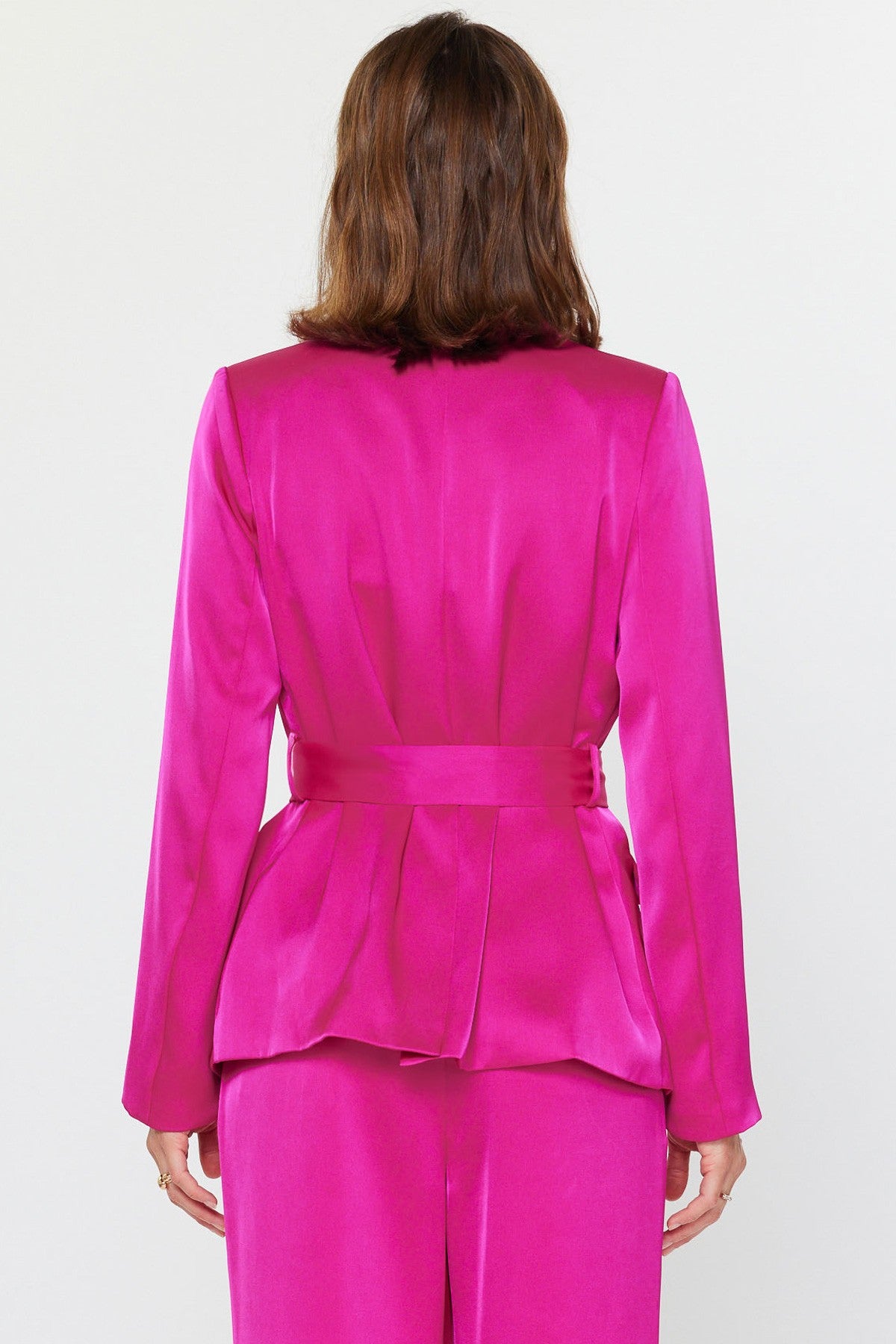 This blazer delivers sleek sophistication with a modern edge. Designed in a silky, satin-like fabric that drapes beautifully, it features a classic notched lapel, flap pockets, and a single-breasted closure. The relaxed yet structured fit is finished with subtle tailoring, giving it that elevated polish whether you wear it open or belted at the waist. Available in both striking fuchsia for a bold statement or timeless black for effortless versatility, this blazer transitions seamlessly from the office to evening events. Style with the matching trouser for a matching suit set to style together or break up for endless looks.