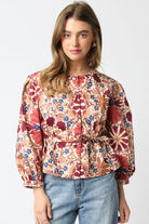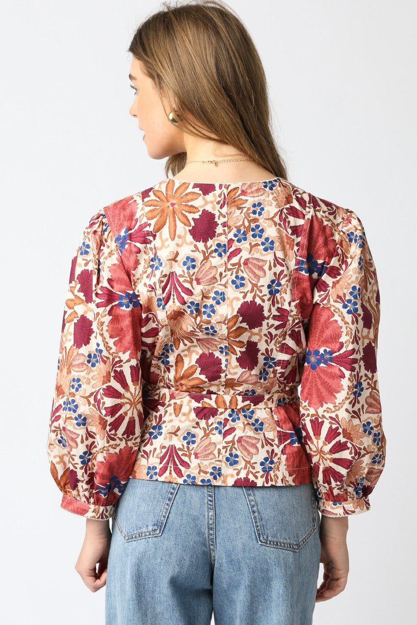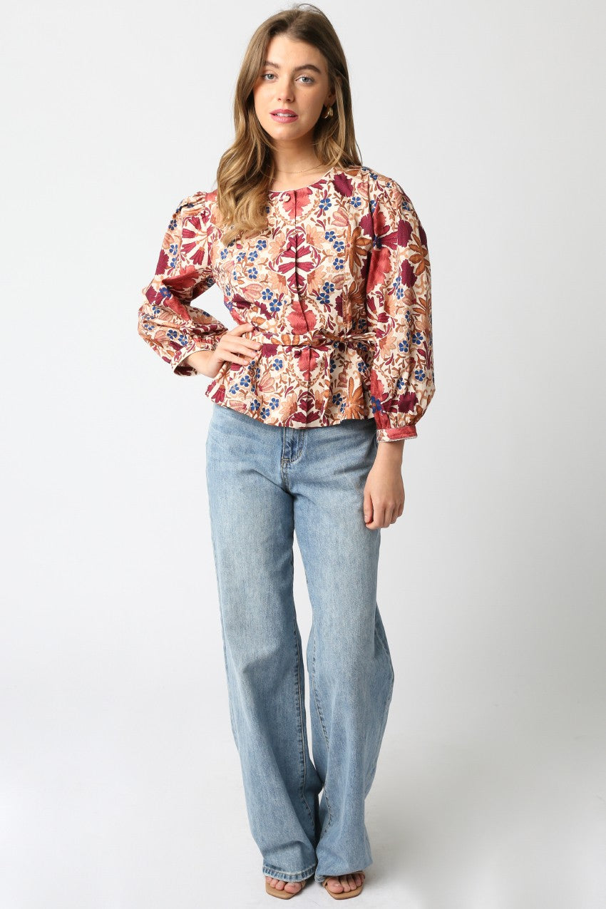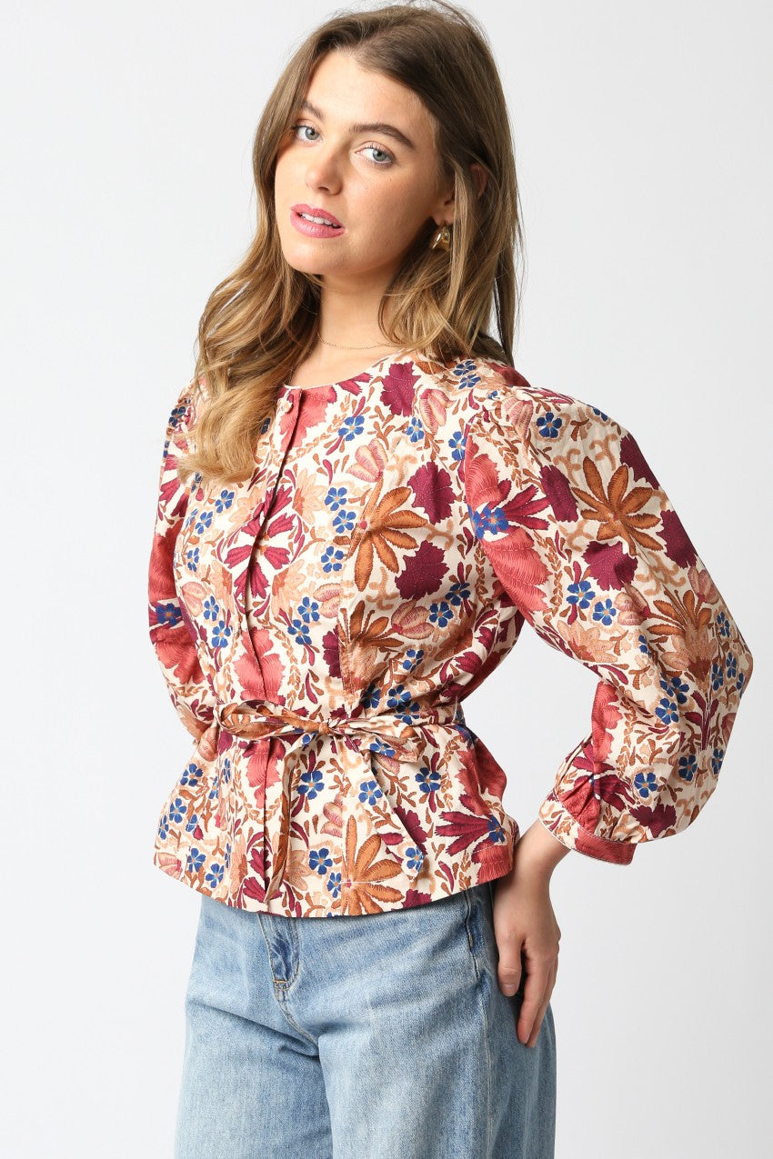 Fresh florals meet timeless tailoring in the Iris Belted Blouse. Featuring a rich tapestry of autumn-inspired blooms in deep wine, rust, and blue, this top brings romantic energy to your everyday look. Designed with voluminous sleeves, subtle pleating, and a flattering peplum hem, the silhouette cinches at the waist with a matching belt for a polished, feminine shape. Pair it with jeans for a chic daytime look or dress it up with trousers and heels for dinner out.