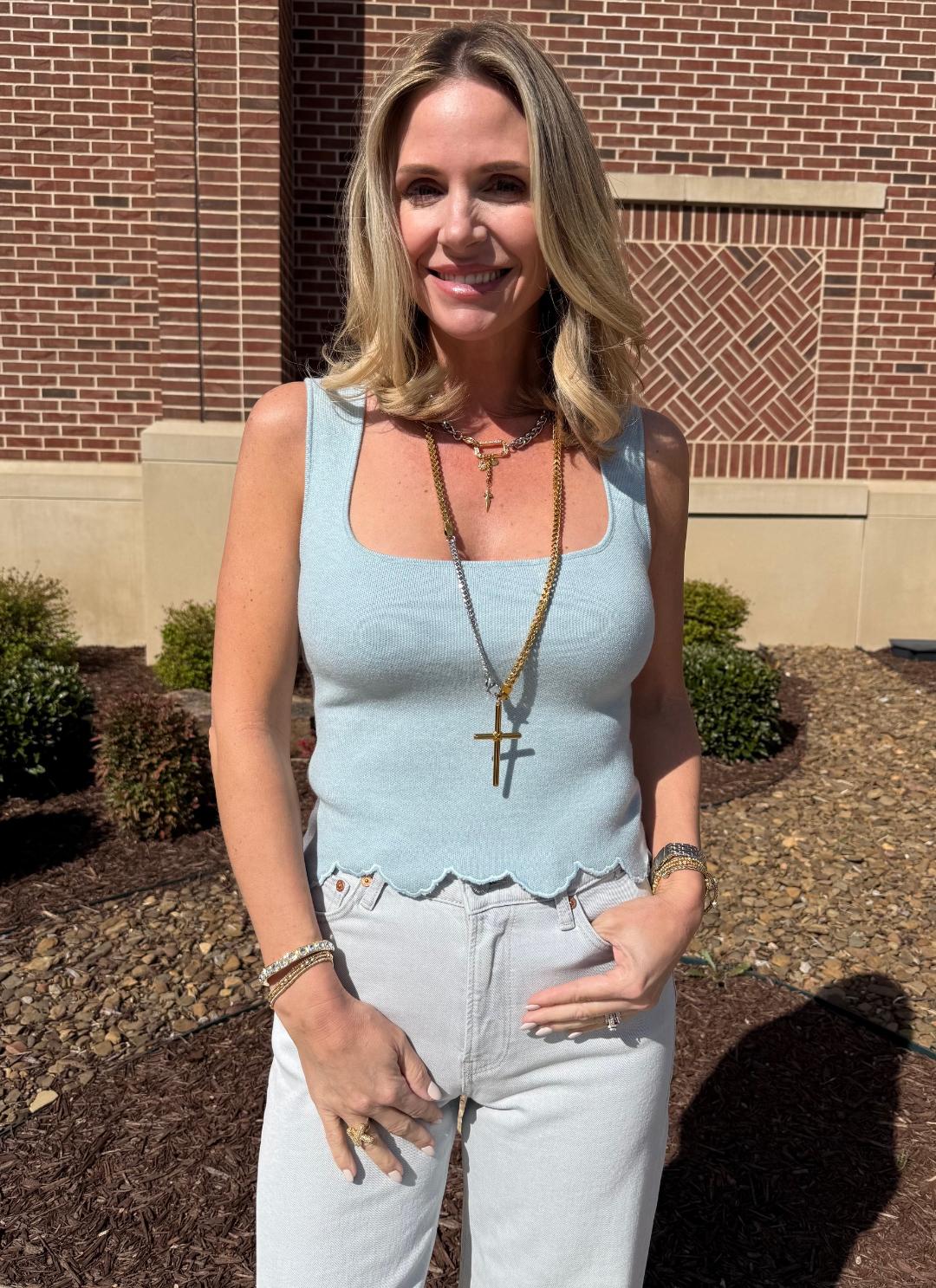 This soft, feminine knit tank is the perfect elevated essential with a playful twist. Designed in a beautiful light blue hue, it’s crafted from a lightweight sweater knit that feels smooth, breathable, and comfortable with just the right amount of stretch. The silhouette is fitted and flattering, featuring a modern square neckline that highlights the collarbone and wide straps that offer easy, bra-friendly wear. A standout detail is the delicate scalloped hemline, adding a subtle, feminine finish that gives this classic tank a more styled, boutique feel. Clean and minimal through the body with a soft, refined texture, this piece is incredibly versatile—easy to wear on its own or layered under a blazer or jacket. Pair it with denim, trousers, or skirts for an effortlessly polished look that works from casual days to dressed-up moments. Shown with our Mavi Florida Wide Leg Denim.