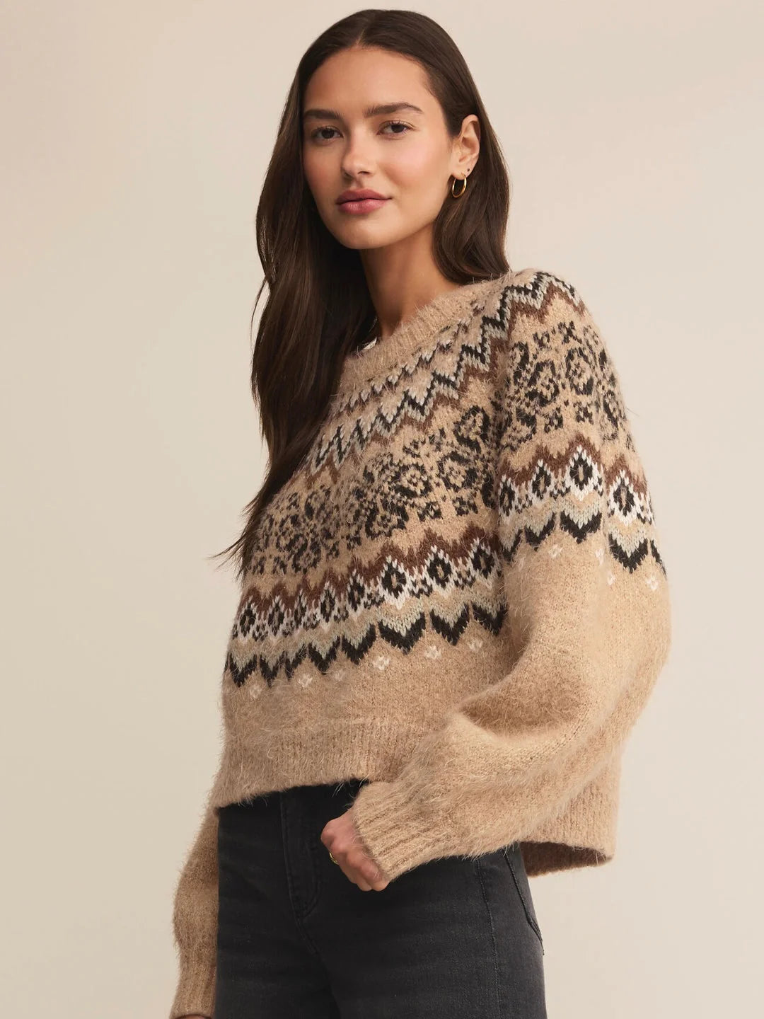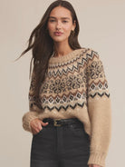 This cozy Fair Isle sweater blends timeless charm with a modern, relaxed silhouette. Knitted in a soft, fuzzy yarn, it features a mix of warm neutrals and earthy tones—dark green, mint, and shades of brown—creating a beautiful, nature-inspired palette. The crew neckline, ribbed cuffs, and hem offer a classic finish. Perfect for cold-weather layering, it pairs effortlessly with denim or our Isolde pant for a balanced mix of casual and chic.