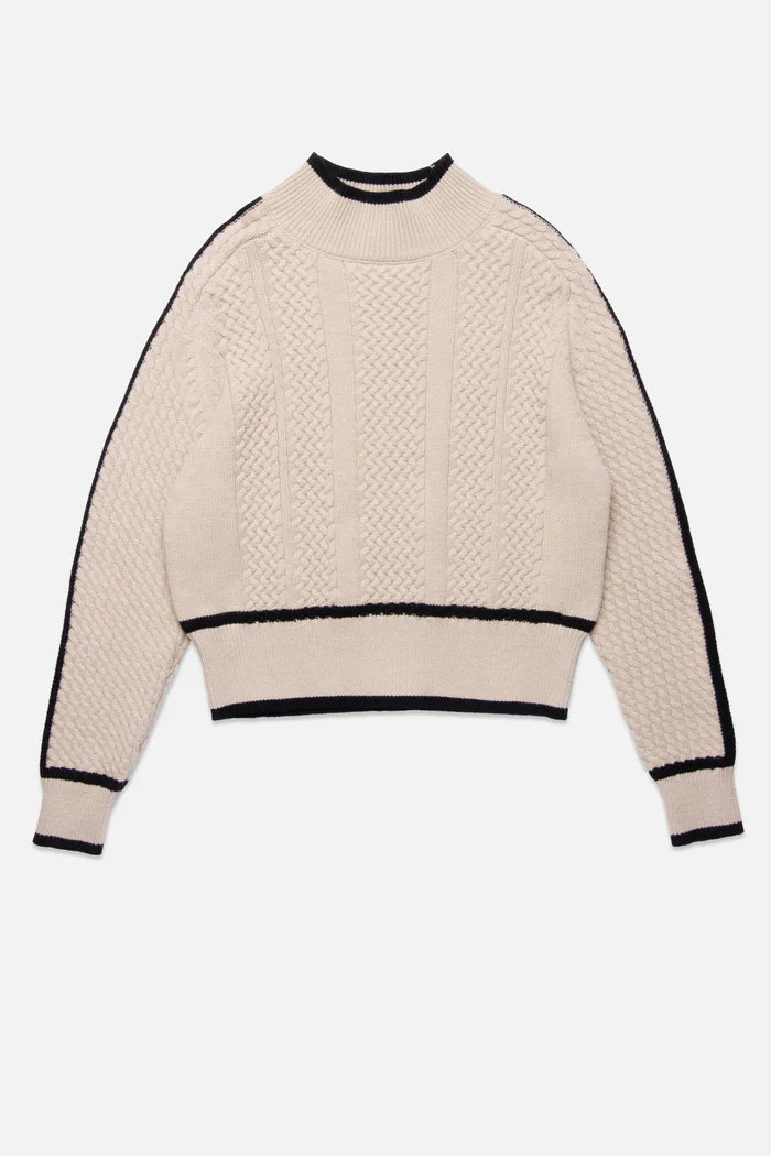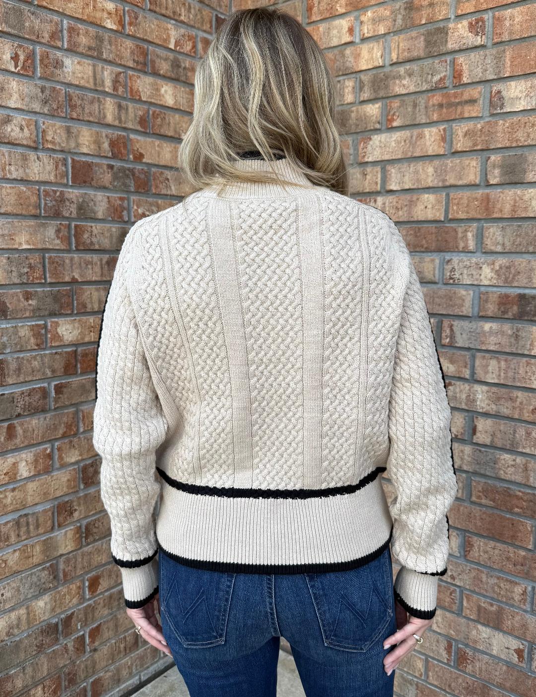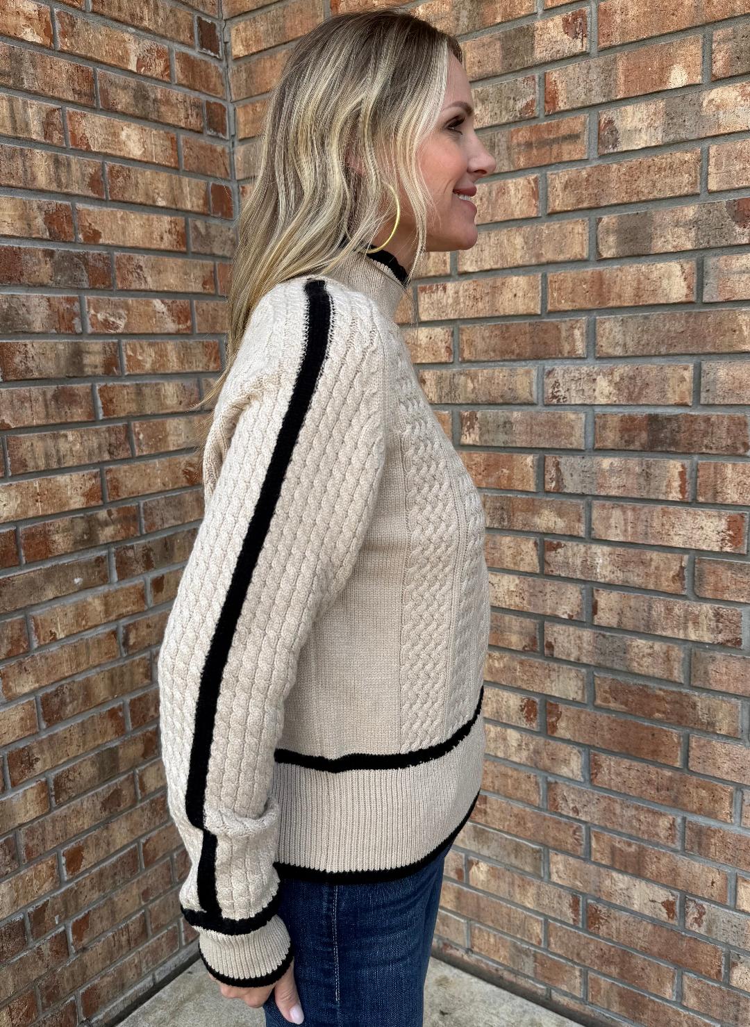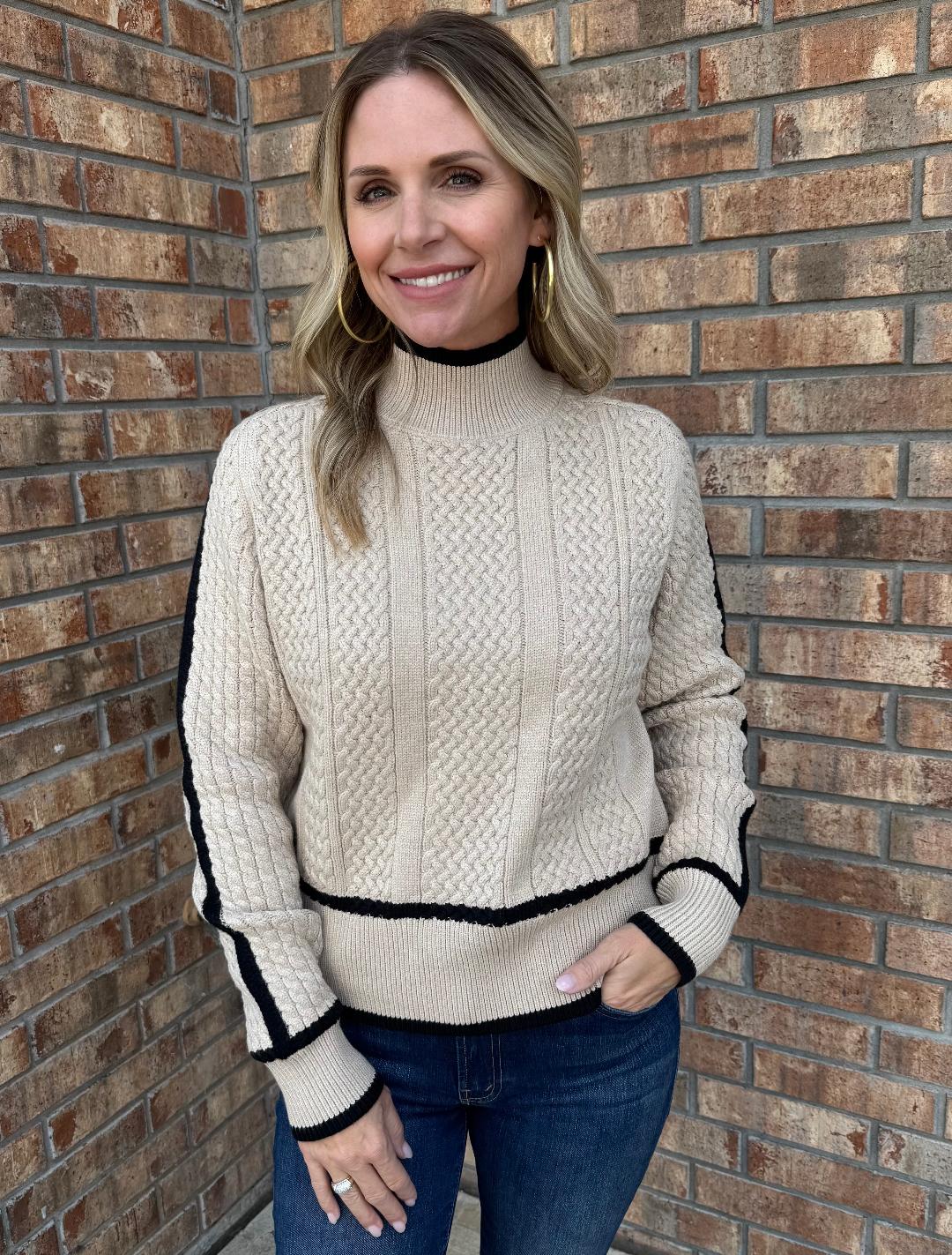 This sweater blends timeless texture with a modern edge. Crafted in a creamy ivory tone, the cable-knit design is framed by bold black trim along the cuffs, hem, and mock turtleneck, adding striking contrast. The relaxed fit and ribbed detailing create a flattering shape that’s both cozy and elevated, while the soft knit ensures comfort for all-day wear. Whether paired with denim for a chic casual look or styled with trousers for a polished finish, this sweater delivers versatile style with a touch of sophistication.