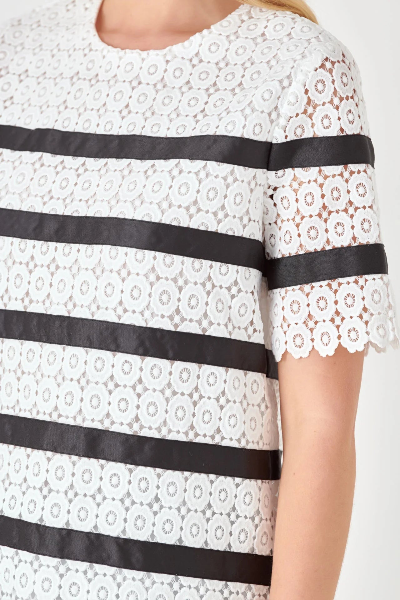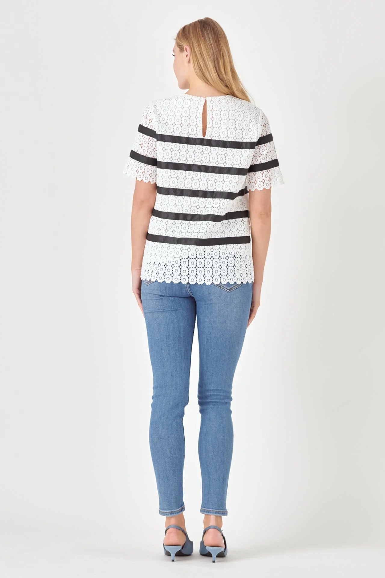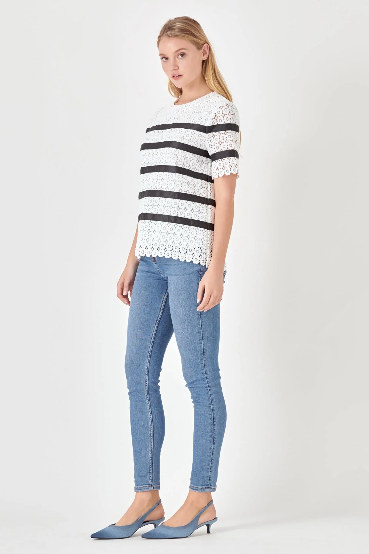 This top reinvents stripes with a little lace and a lot of style. Whether you're headed out the door to work, meeting friends for coffee or enjoying a night out this top adds instant chic to trousers, shorts or denim. Layer a structured blazer for a touch of polish. However you style it. the delicate lace detailing and bold black stripes is sure to make this your new go-to for casual glam.