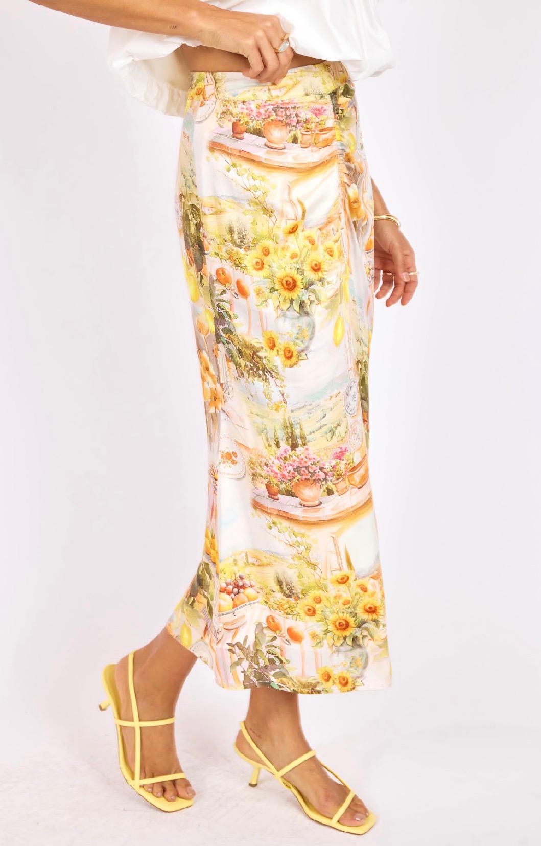 This dreamy midi skirt features a soft, artful print with warm citrus tones and scenic details that give it a fresh, European-inspired feel. Designed with a flattering, easy drape, it skims the body beautifully while maintaining a lightweight, flowy silhouette. Subtle ruching at the front adds a touch of texture and shape, enhancing the fit in a soft, feminine way. The midi length makes it effortlessly versatile—perfect for dressing up with heels or keeping it casual with sandals. Style with our Alexis Avocado Knit Tank or the matching Limoncello Ruched Tank.