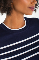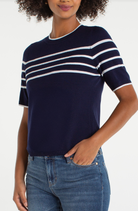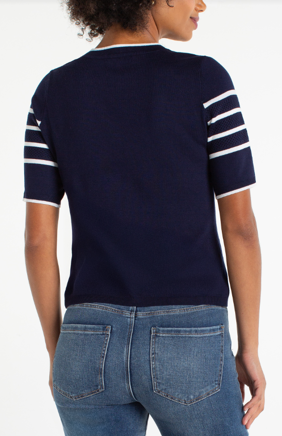 This navy short-sleeve sweater has a timeless, sporty feel with crisp white horizontal stripes and subtle texture between each line. The waffled knit detailing adds depth and dimension across the chest and sleeves, while the smooth body keeps the silhouette clean and flattering. Crafted from a soft, medium-weight knit with gentle stretch, it offers structure without feeling heavy. The ribbed crew neckline and sleeve cuffs trimmed in white complete the polished look. Effortlessly versatilem for year-round wear through all the seasons, it pairs beautifully with high-rise denim, trousers, or even a pleated skirt for a chic, nautical-inspired style.