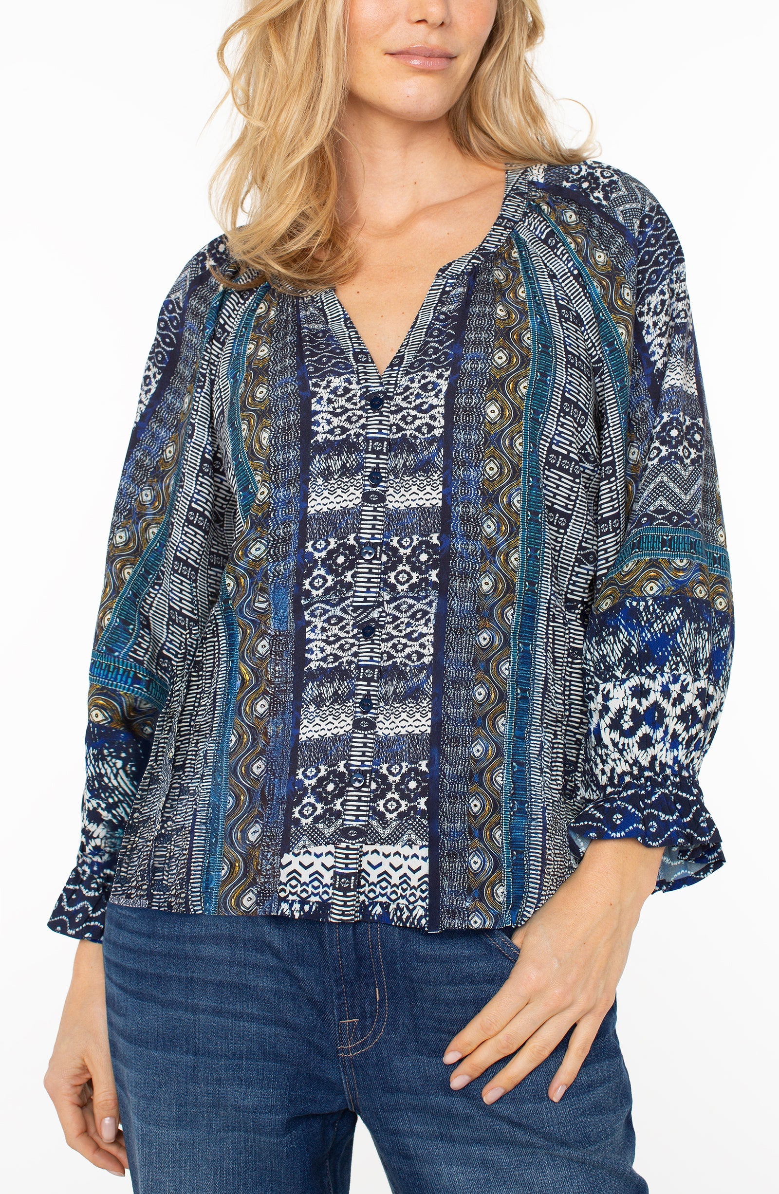 This airy blouse features a painterly blue shibori pattern, softened by shirring at the neckline and a relaxed raglan sleeve. Ruffled cuffs and a button-front closure add a hint of romance, making it the perfect piece to dress up your denim or bring movement to tailored layers.