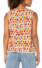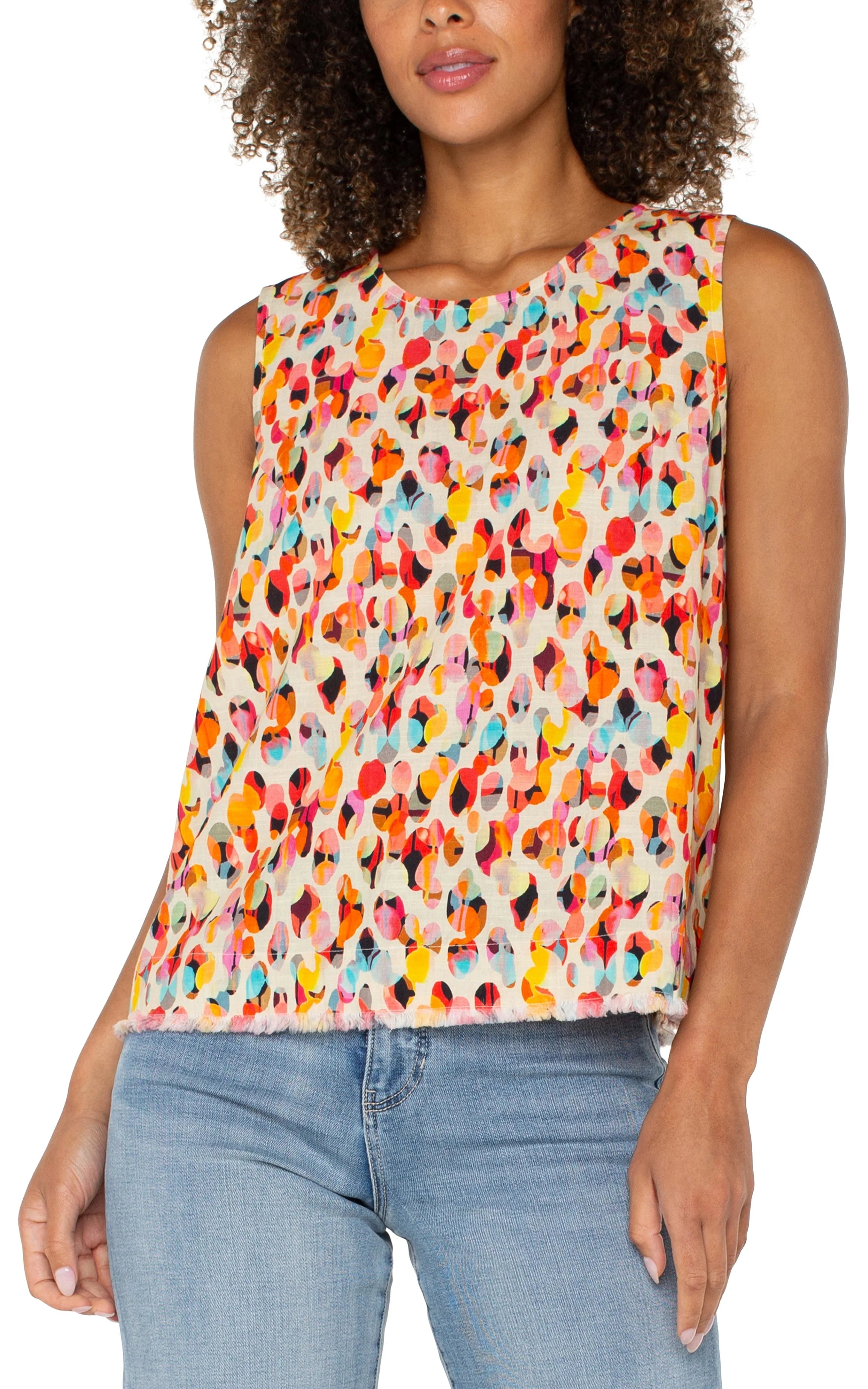 Elevate your wardrobe with this beautiful sleeveless top, showcasing a button back and frayed hem. Perfectly sophisticated and easily pairs with trousers or denim for an effortless look. We love the colorful watercolor dot print!