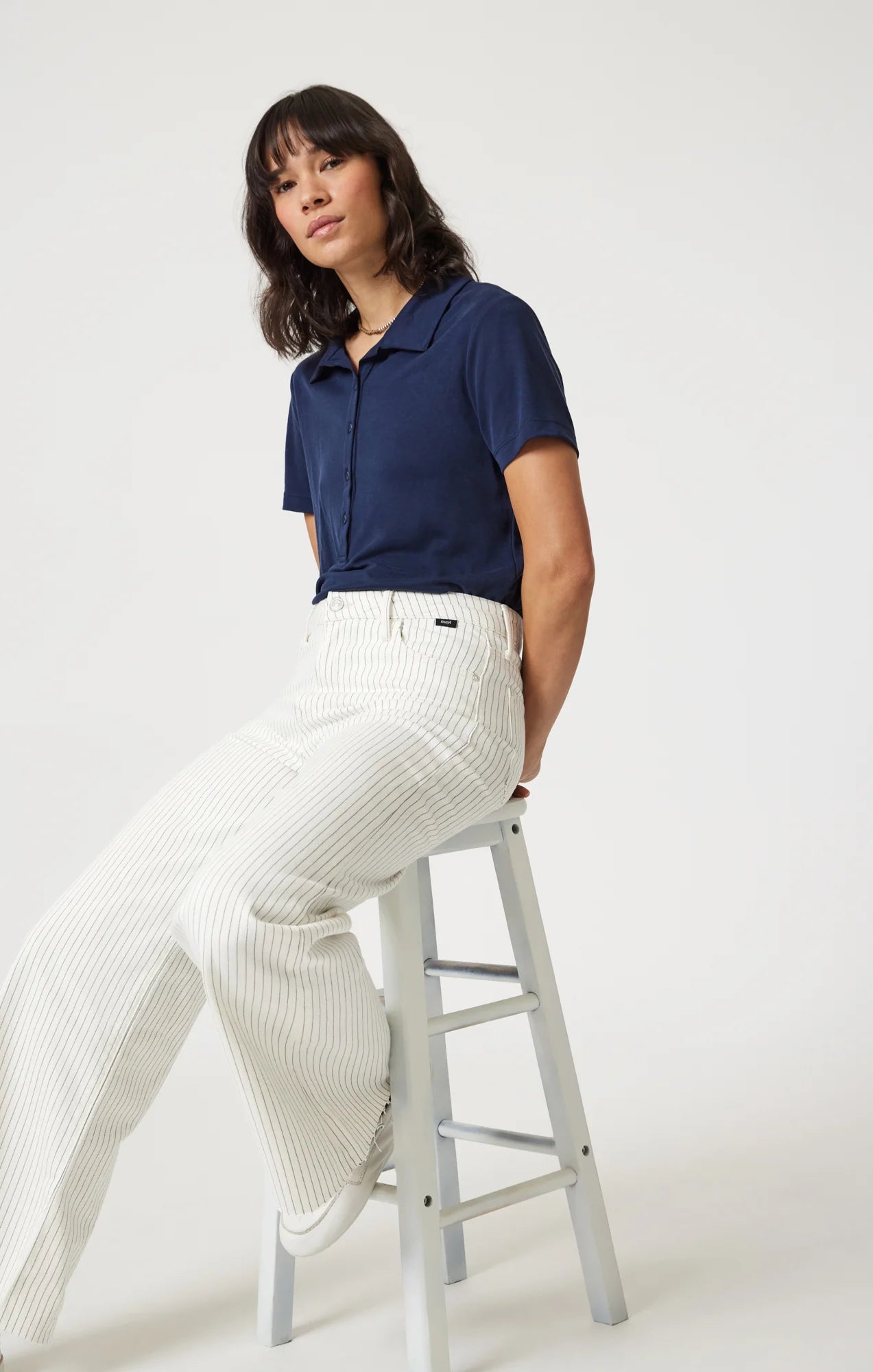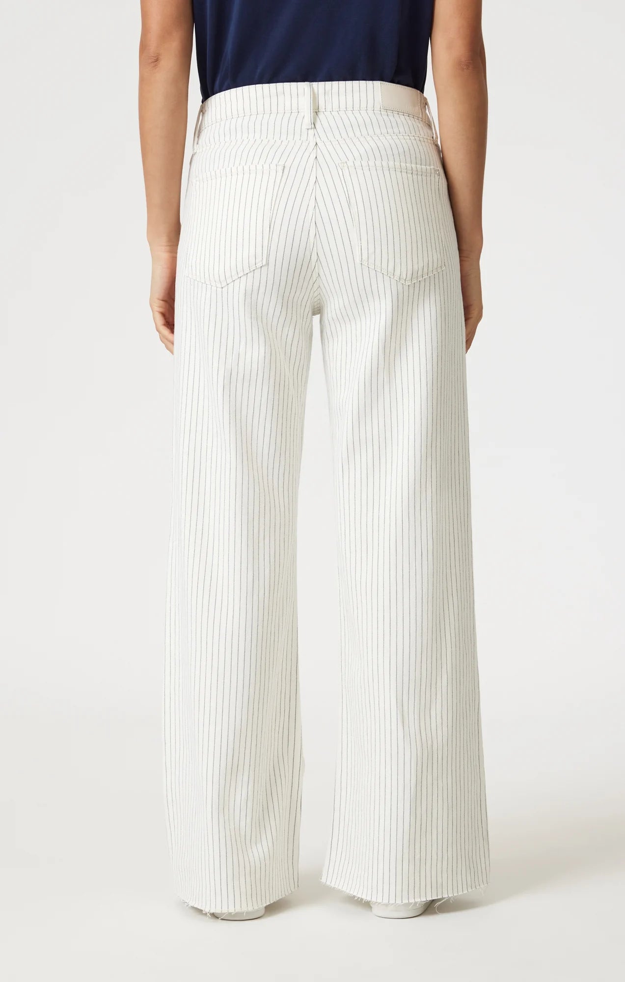 A wide leg style that fits slim through the hip and thigh, Paloma creates an ultra-flattering silhouette without ever feeling too tight. A raw hem and cropped fit complete the chic look. Finished off with an off-white wash and light gray pinstripes.