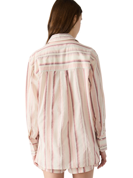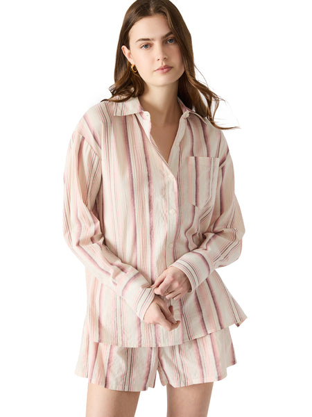 An airy cotton textured striped button up shirt to style back to your favorite denim shorts or jeans. Unbutton and wear over your swimsuit beachside!