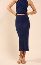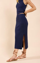 Super soft, wide ribbed knit navy midi skirt that is comfortable and hugs your figure in all the right places. Style it with a simple white tee and denim jacket or, of course, its matching No Bad Days Ribbed Knit Tank for a head-to-toe effortless outfit.