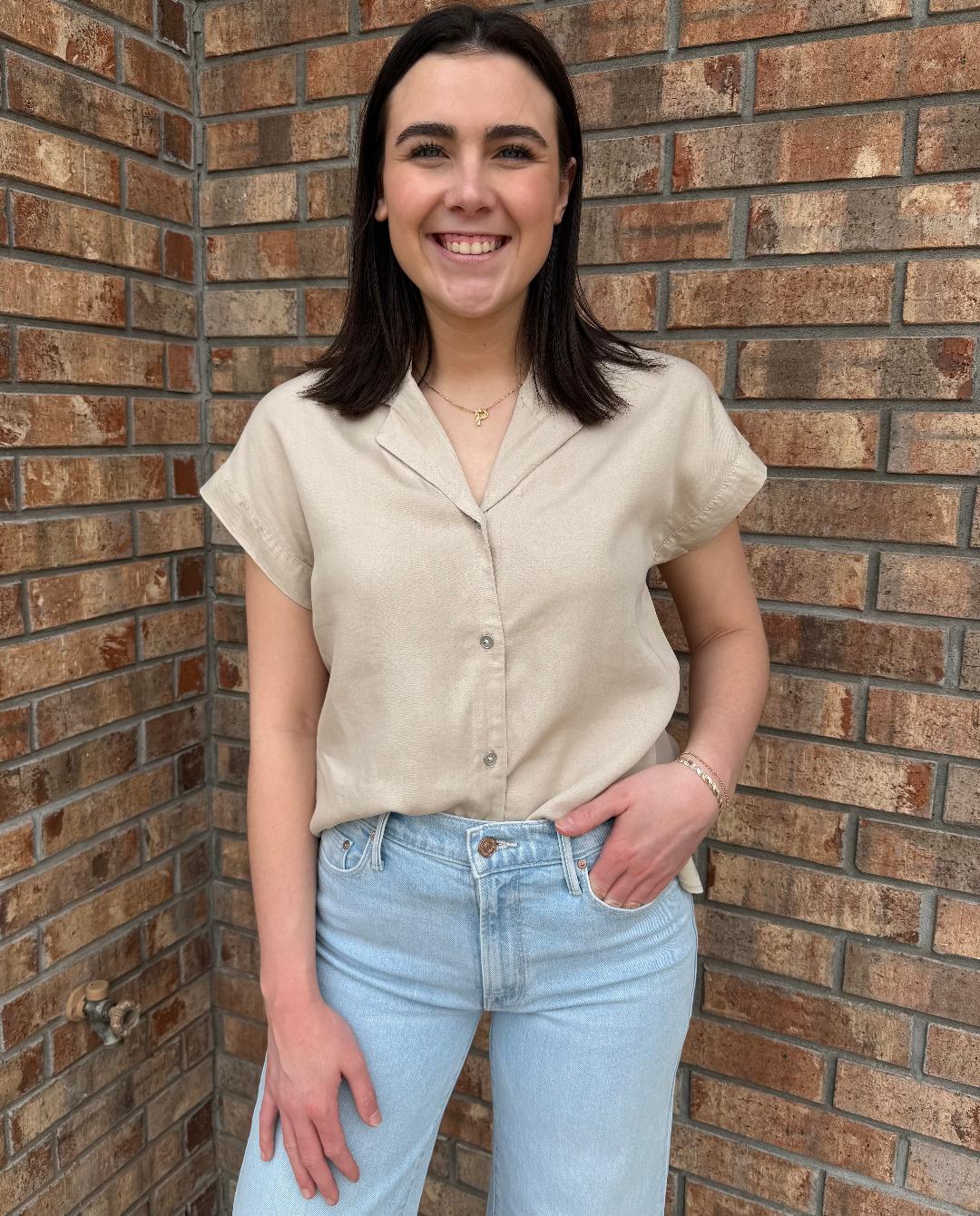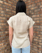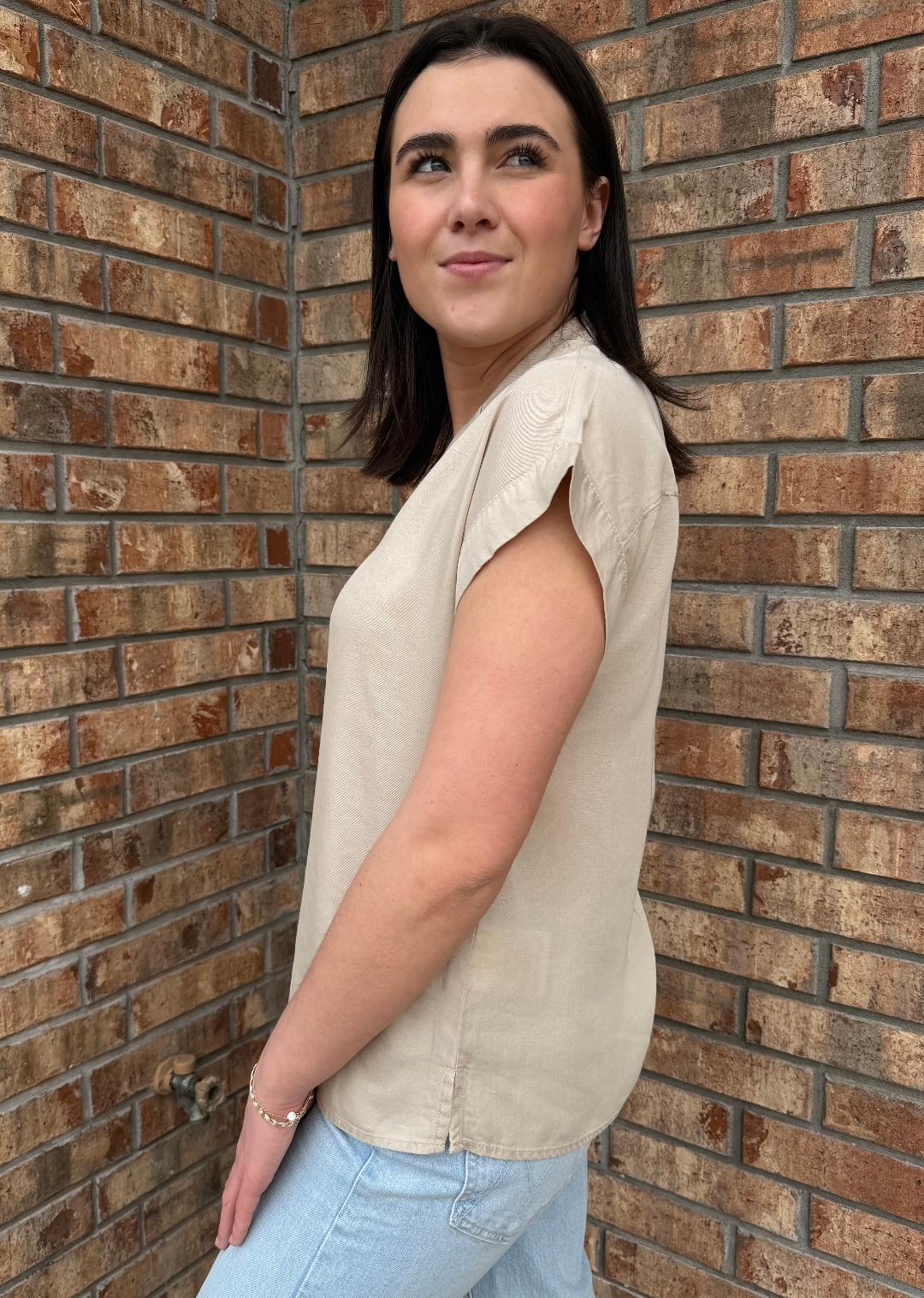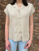 Timeless pieces like this are essential for your wardrobe. This notched lapel button up shirt is made in a smooth, soft lyocell fabric and the neutral go-with-anything khaki color gives versatility.