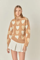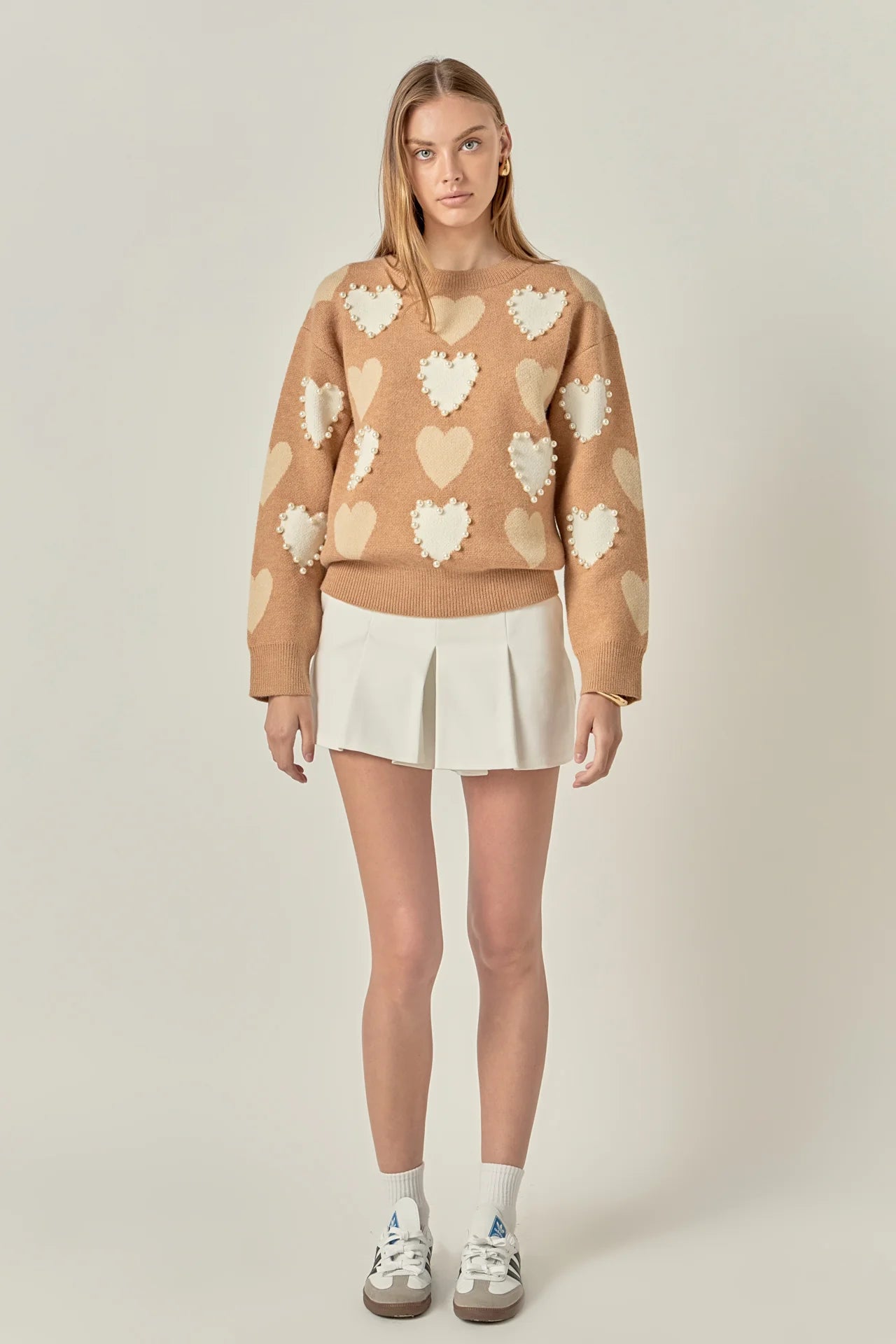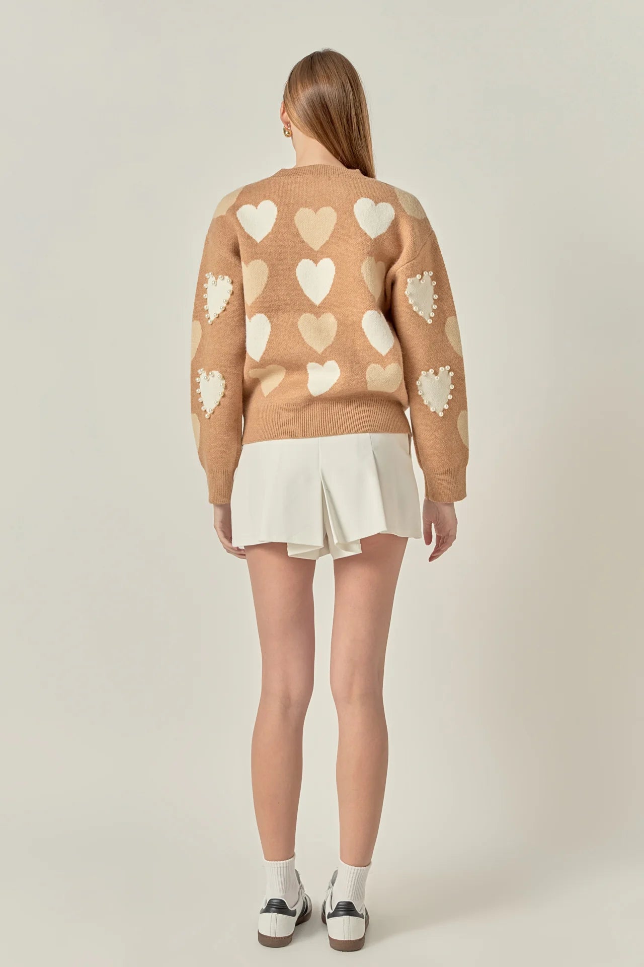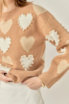This is a playful camel-toned knit sweater with an all-over ivory/light tan heart motif. Some of the hearts are flat knit, while others are outlined with faux pearl beading, adding a textured and feminine touch. The sweater has a crew neckline, long sleeves with ribbed cuffs, and a ribbed hem that gives it a cozy yet structured fit. The slightly relaxed silhouette makes it comfortable, while the pearl accents elevate it beyond a casual sweater—perfect for dressing up with a skirt or keeping it sweet with denim. The mix of soft neutrals and whimsical details gives it a versatile, youthful charm that works for both everyday wear and special occasions.