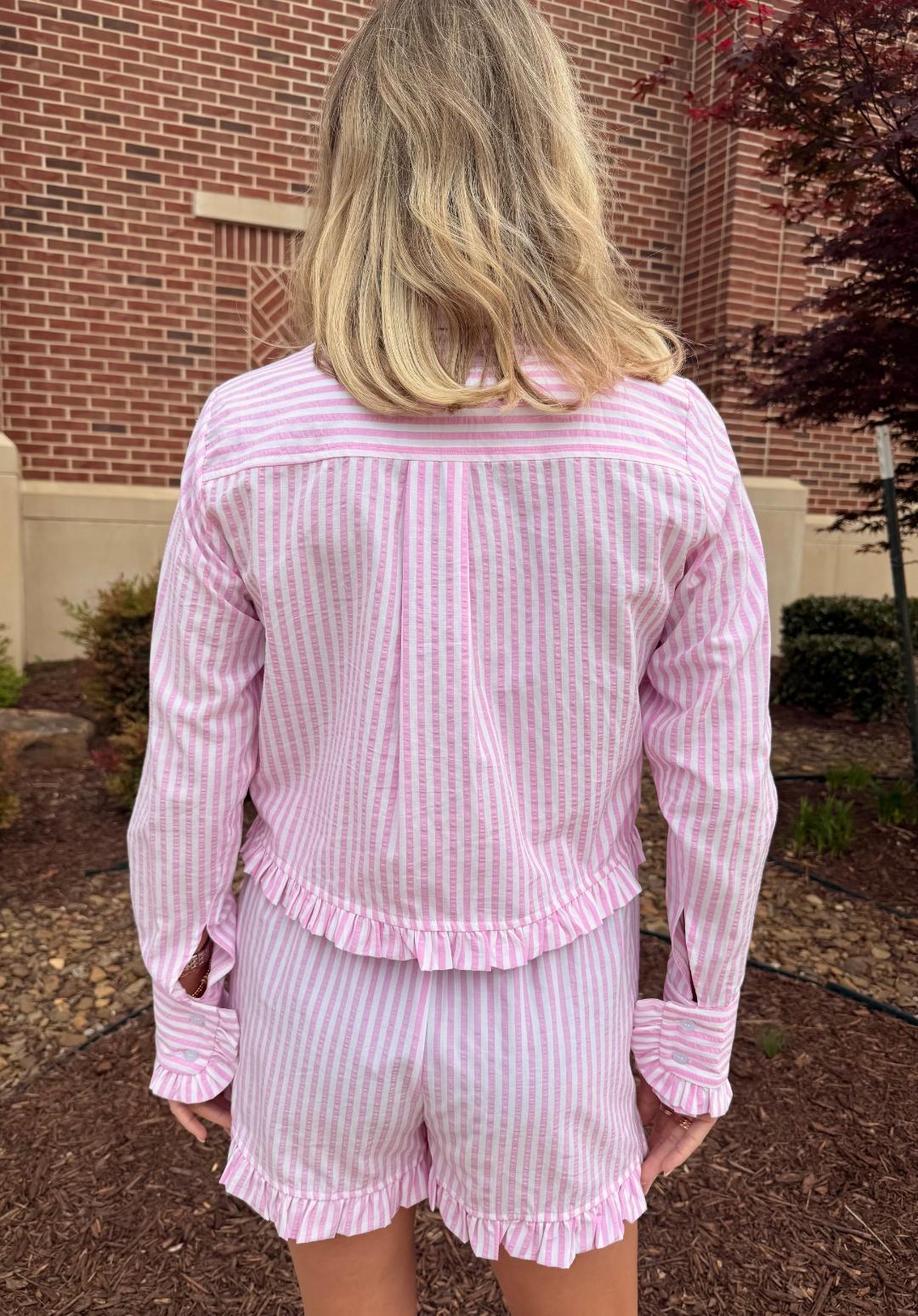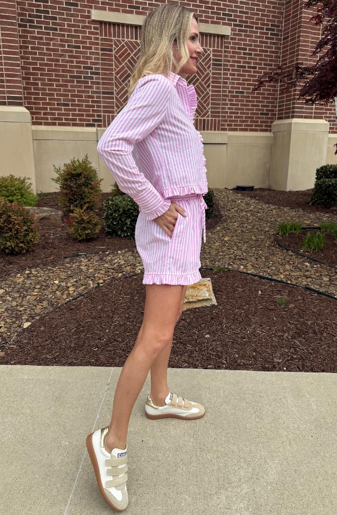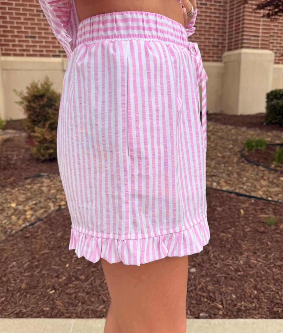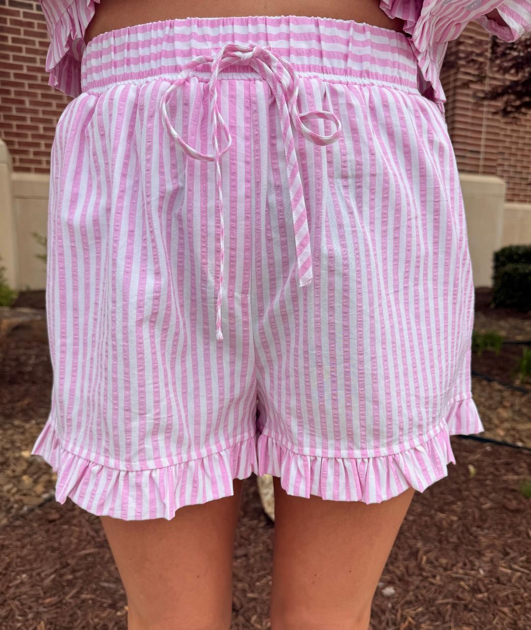 These pink and white striped shorts are the perfect blend of polished and playful. Designed with a comfortable elastic waistband and adjustable drawstring tie, they offer an easy, flattering fit. The relaxed silhouette is finished with delicate ruffle trim along the hem for a feminine touch, while side pockets add everyday functionality. Lightweight and breathable, they’re perfect styled as a set with the matching shirt or mixed with simple basics.