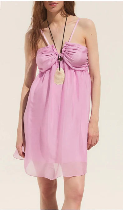 This effortlessly elegant mini dress is part of a special collection by Deluc, made in Italy. Crafted in a luxe silk-viscose blend, giving it a soft, airy feel with a beautiful fluid drape. Designed with a flattering empire waist, it features a delicately gathered bust with an adjustable center detail that allows you to customize the neckline to your liking. The slender shoulder straps are also adjustable, ensuring the perfect fit and support. The bodice is softly smocked through the back for added comfort and flexibility, while the skirt flows into a breezy, flirty silhouette that moves gracefully with you. Fully lined with a lightweight, breathable knit, this piece offers ease and coverage without sacrificing that light-as-air feel. An elevated yet effortless style, perfect for warm days, vacation moments, or dressed up evenings.