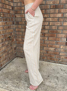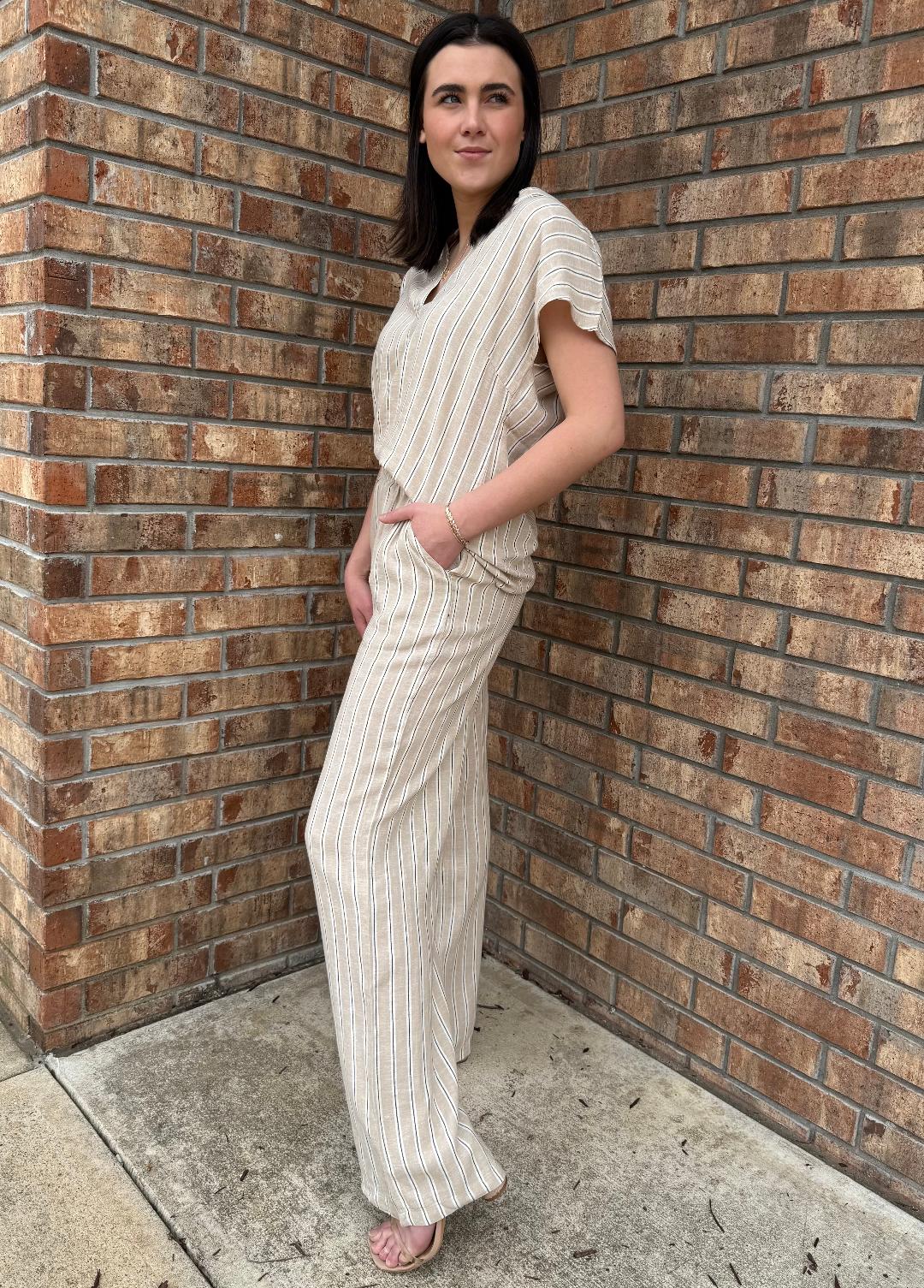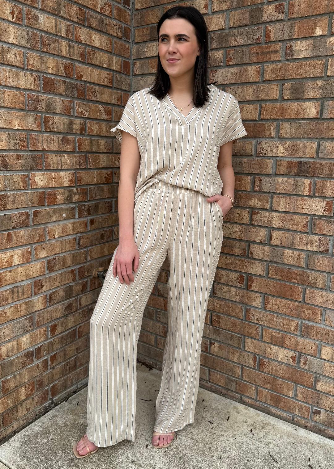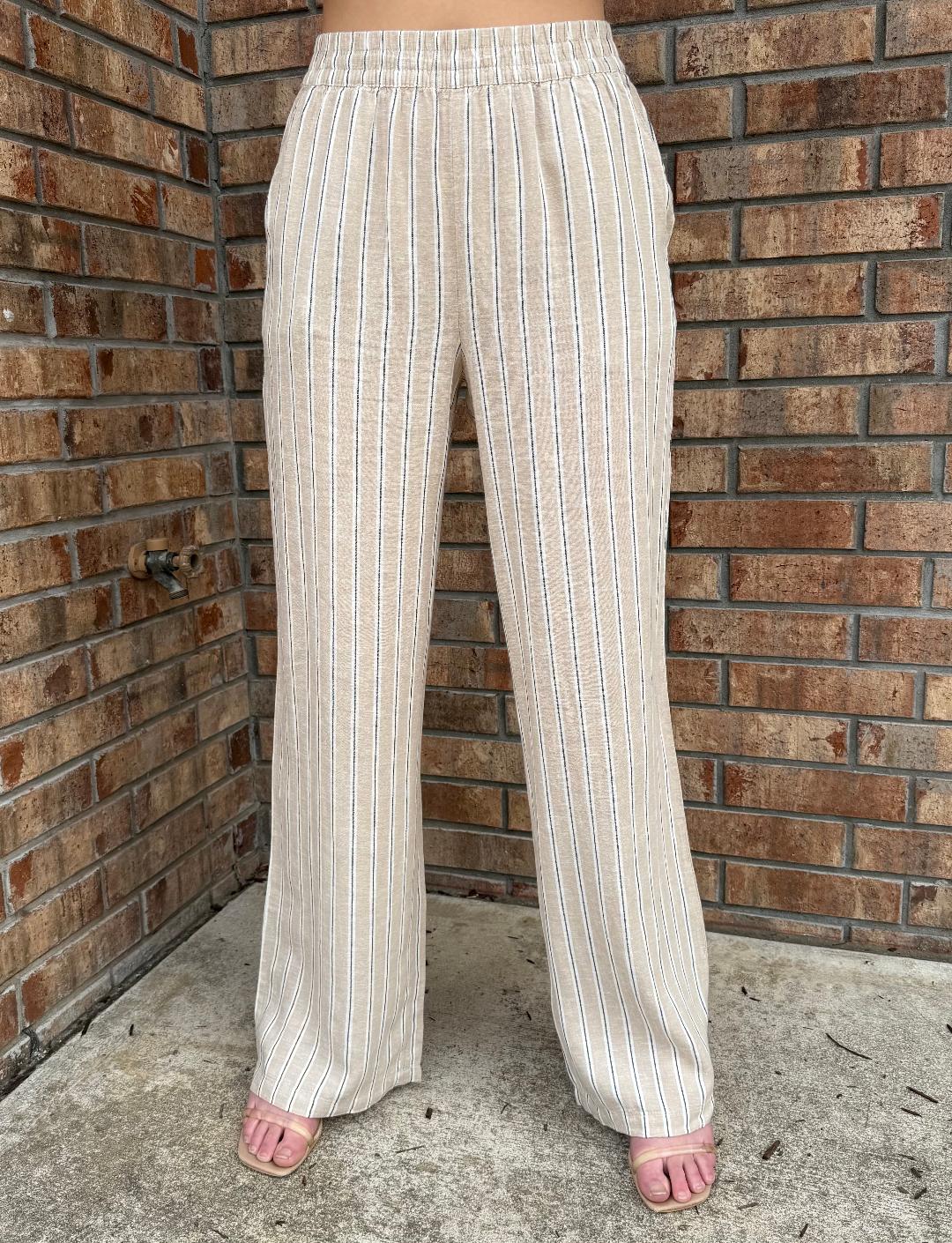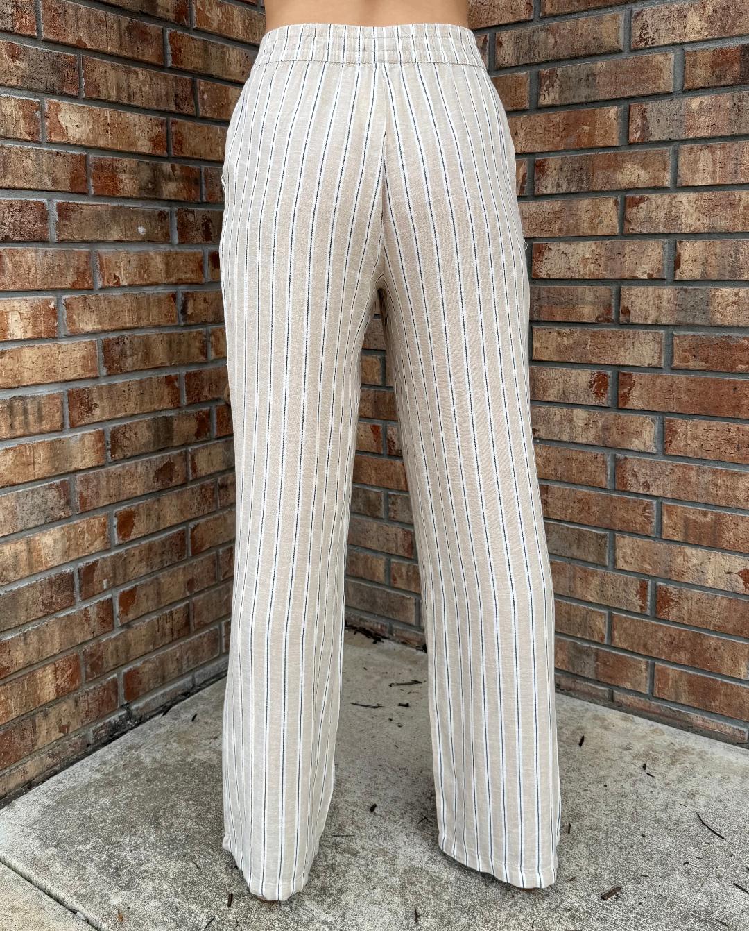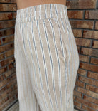 Relaxed yet polished. The earthy khaki, white and black stripes are figure flattering and elongating in this vertical pattern. Comfortable, breathable linen/viscose fabric with an elastic waist and the side pockets add practicality without compromising the clean, chic look. Pair with the matching top and sandals for a laid back vibe or elevate it with wedges and jewelry.