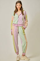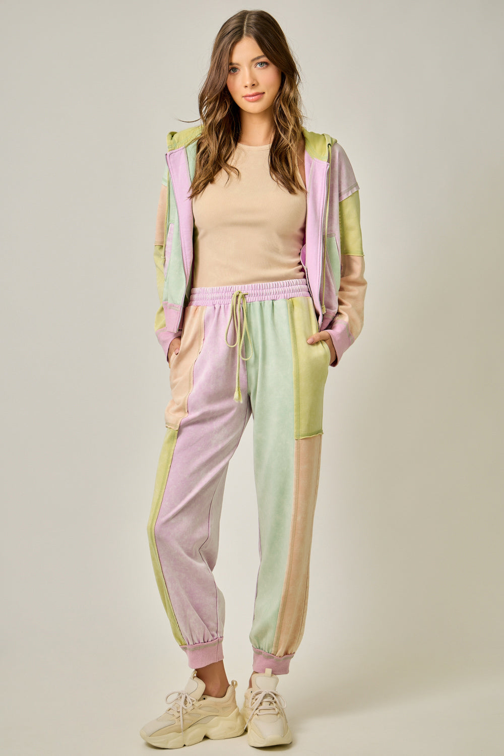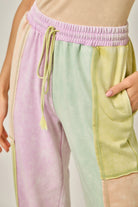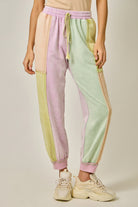 These joggers mirror the same soft, mineral-washed pastel color-block pattern as the matching hoodie for a standout yet easy look. Designed with a comfortable elastic waistband and adjustable drawstring, they offer a relaxed fit through the leg with ribbed cuffs at the ankle for a modern silhouette. Side pockets add function, while the exposed seam details enhance the laid-back, lived-in feel. Equal parts cozy and cool, these joggers are perfect styled with the matching hoodie or paired with a simple neutral tee and sneakers for effortless everyday wear.