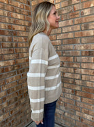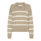 Crafted in a soft, lightweight knit, this sweater features wide horizontal stripes in a neutral beige and ivory palette, making it versatile for year-round wear. The relaxed silhouette is elevated by a polished open polo collar with a V-neckline, striking the perfect balance between casual ease and refined style. Long sleeves with ribbed cuffs and hemline give it a cozy finish, while the drop-shoulder design adds to its laid-back appeal. Perfect for pairing with denim, shorts, tailored trousers, or layered under a blazer, this sweater is an effortless wardrobe staple that transitions seamlessly from work to weekend.