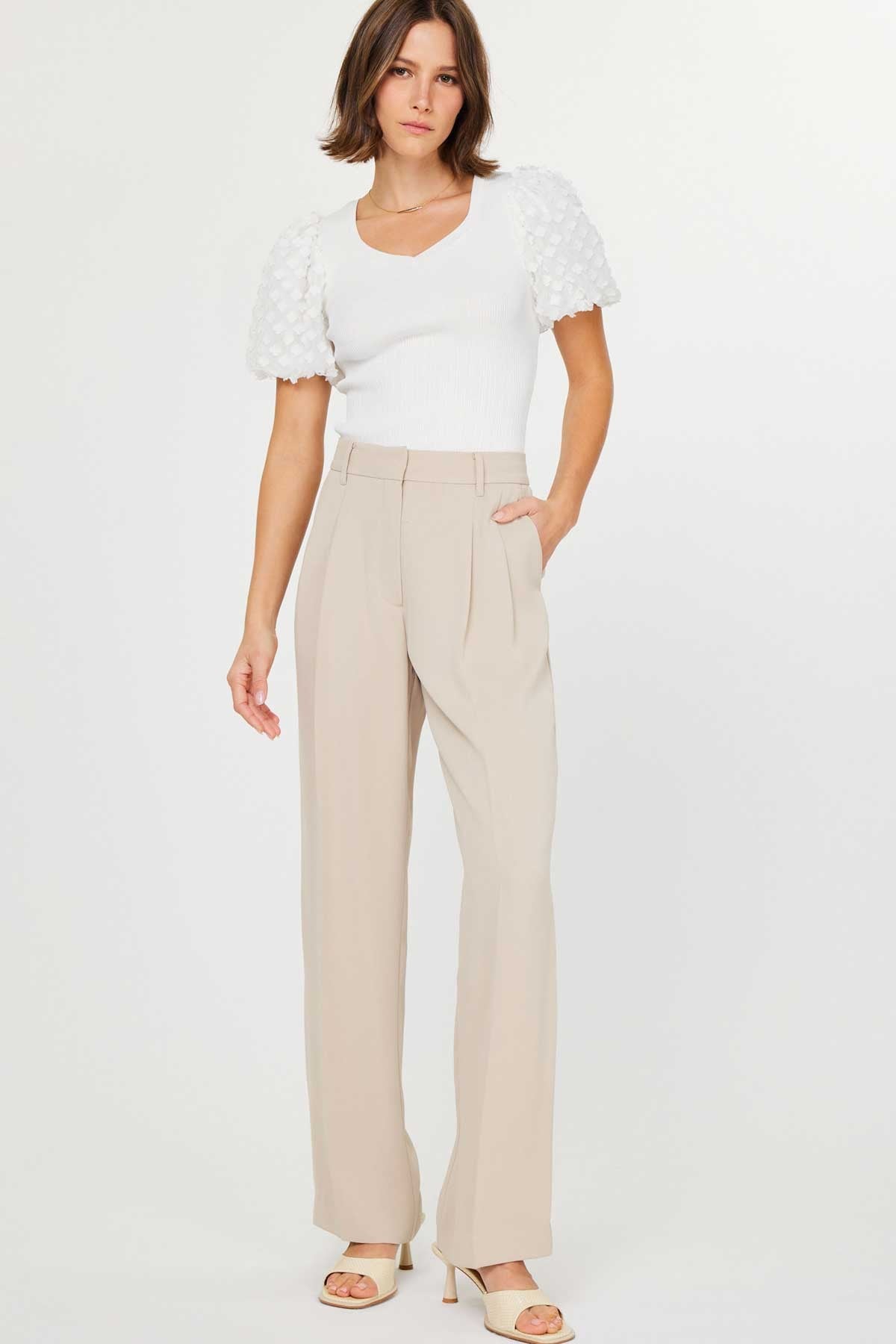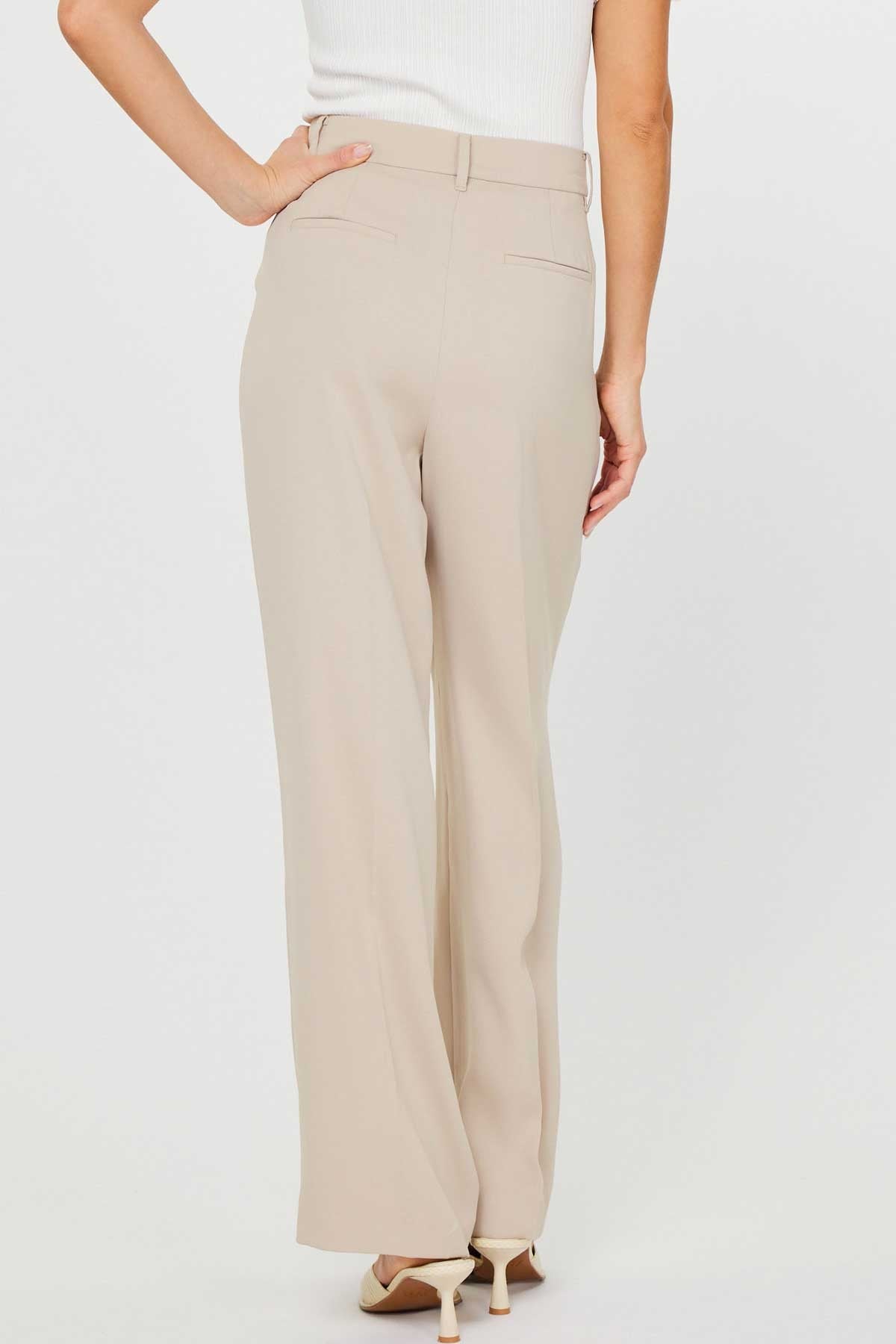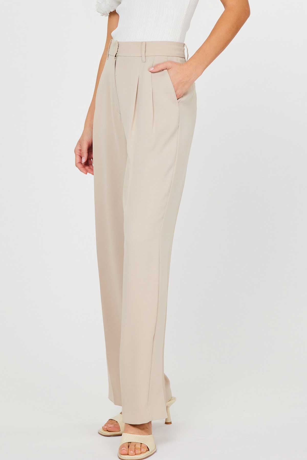 A beautiful drape and fit embodies these light taupe, wide leg trousers. Polished with subtle front pleating, side pockets and faux welt back pockets. These give your wardrobe versatility and elevated, updated style.