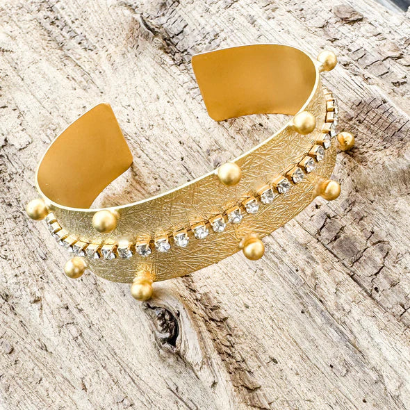 The Farrah Cuff is where glam meets edge—crafted with a textured gold band, sparkling crystal row, and bold raised studs. A striking accessory that instantly elevates your stack.
