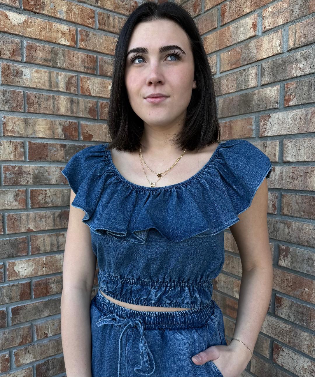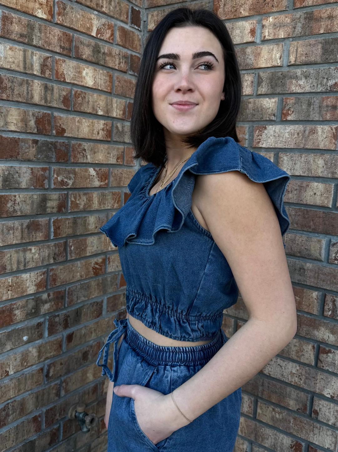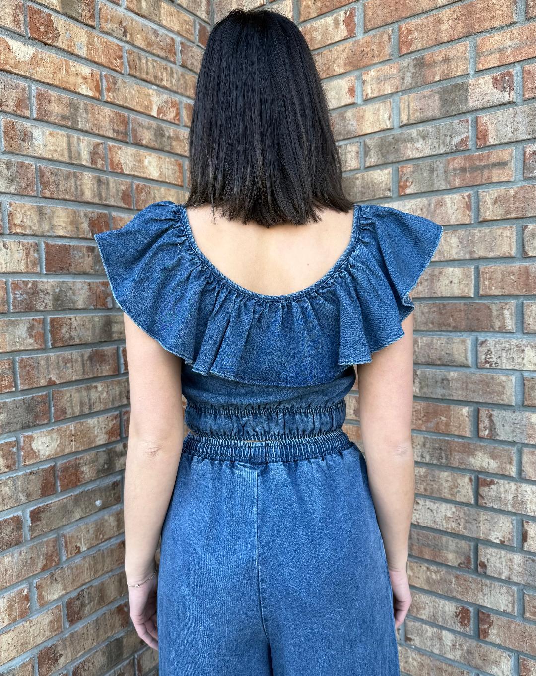 Denim is all the rage this Spring. This top can be styled with any bottom of your choice or style it with its matching pants HERE. A fun and flirty wide ruffled neckline leads way to an elastic hemline.